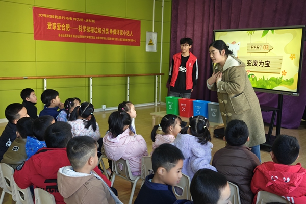 活动现场,合肥师范学院的大学生志愿者们化身“环保导师”,结合幼儿认知特点,通过色彩鲜明的实物图片、生动形象的卡通动画和通俗易懂的儿歌口诀,向孩子们讲解垃圾分类的标准与意义:“废纸、塑料瓶是可回收物,能变废为宝;剩菜剩饭是厨余垃圾,能做成有机肥;电池、过期药品是有害垃圾,要单独存放;烟头、卫生纸是其他垃圾,需统一处理。”直观地展示和趣味化地讲解,让孩子们快速记住了各类垃圾的分类要点。