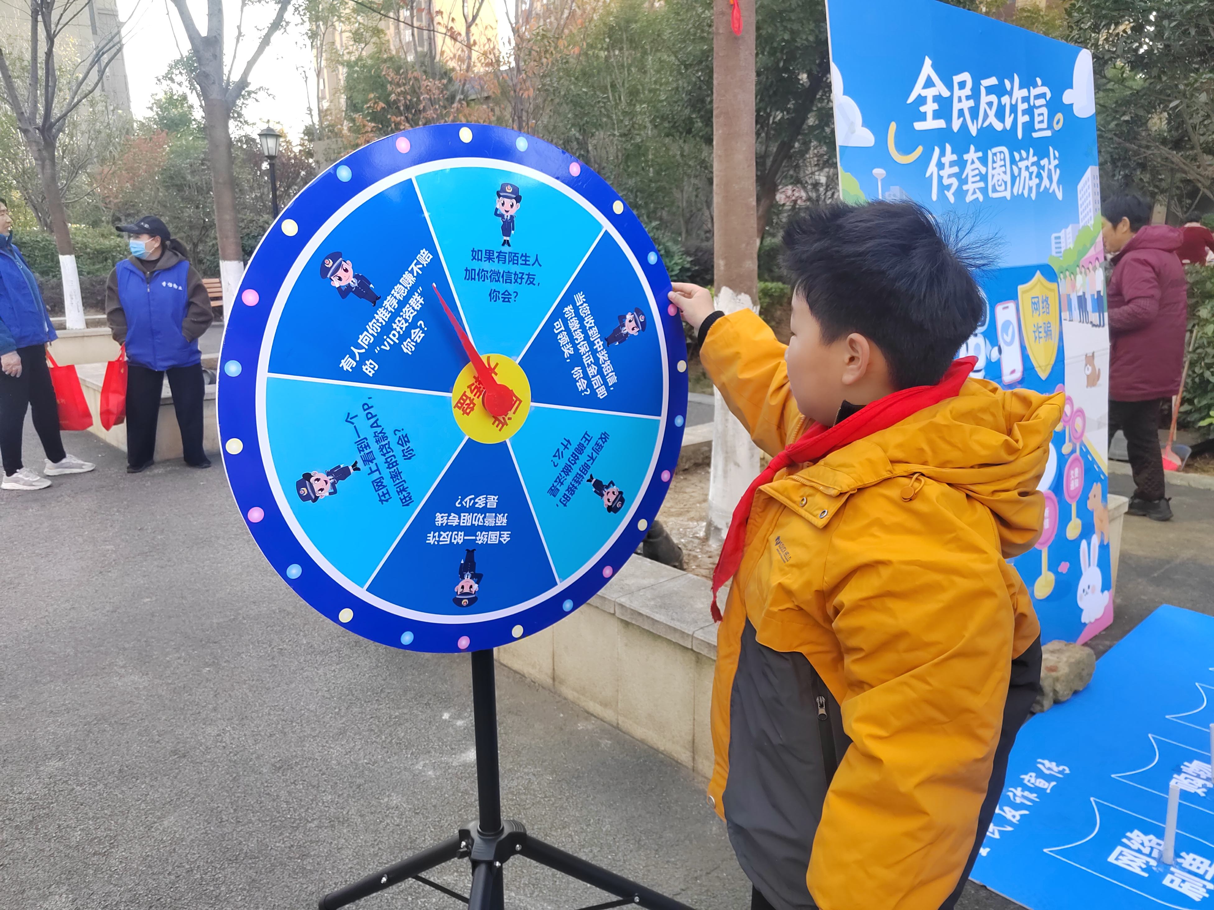 转转盘回答问题游戏区同样热闹非凡。一个大型的反诈知识转盘吸引了众多居民驻足。居民转动转盘,指针停止后,根据所指区域回答相应的反诈知识问题。问题涵盖了诈骗手段识别、防范措施等多个方面。不少居民都能回答正确,而对于回答错误的居民,工作人员则会详细地进行讲解,帮助他们掌握正确的反诈知识。