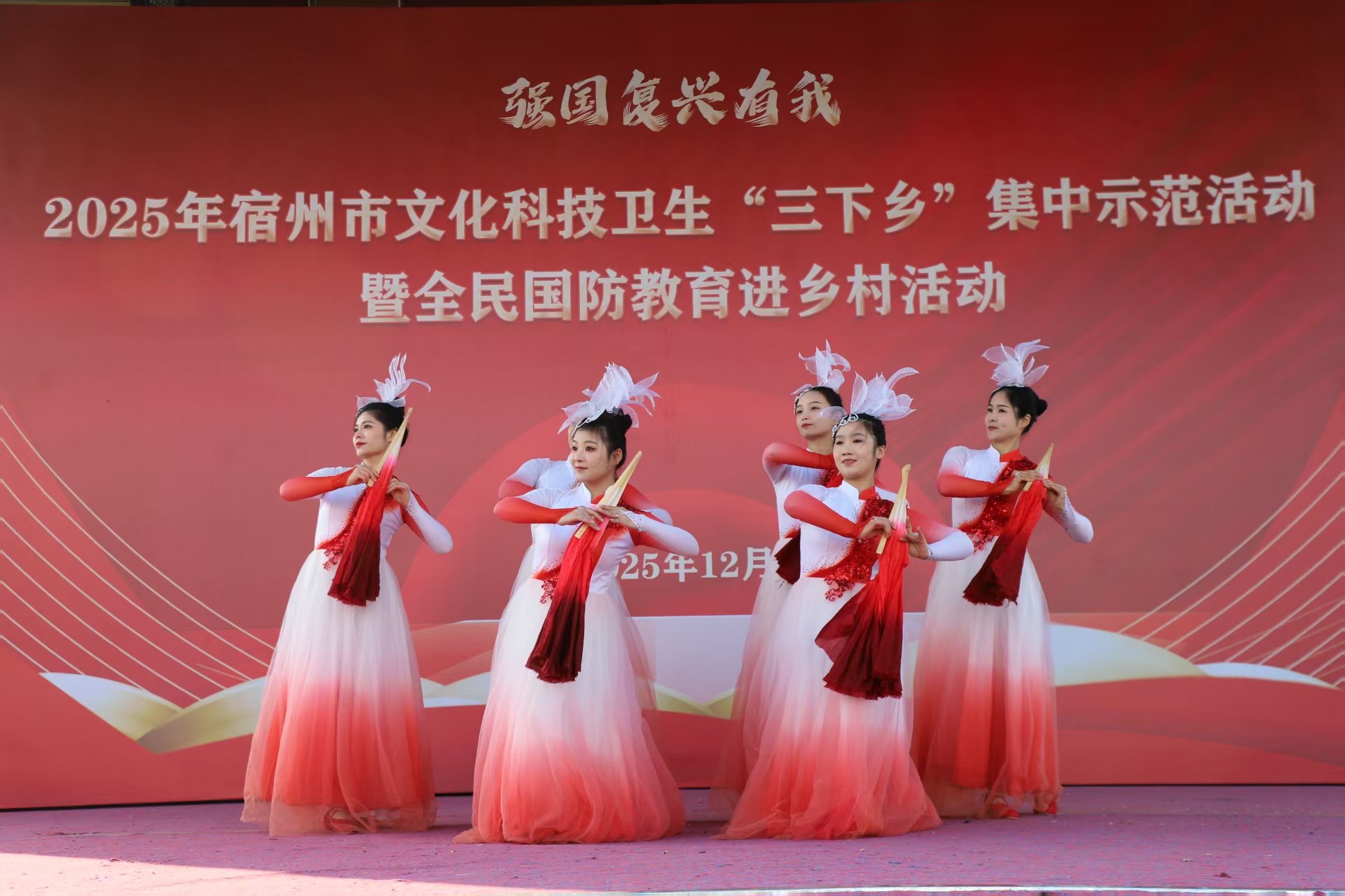 文艺演出在埇桥区花鼓戏剧团歌伴舞“万疆”激情飞扬的旋律中拉开帷幕。紧接着由中国马街大鼓书场状元葛志茹演唱的“淮北大鼓”、女声独唱“山丹丹花开红艳艳”“给你点颜色”,快板“国防教育记心间”,女声独唱“前门情思大碗茶”“最炫民族风”,花鼓戏歌舞“红梅赞”,花鼓戏“王小赶脚”等轮番上阵,丰富多彩的节目,精彩的艺术表演,让村民大饱眼福,如痴如醉。文化科技卫生“三下乡”暨全民国防教育进乡村活动在歌伴舞“五星红旗”激情澎湃的歌声中落下帷幕。