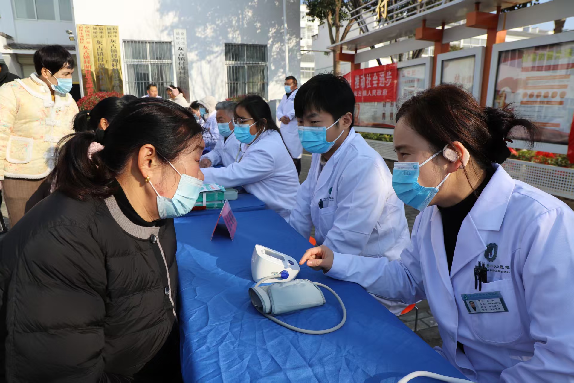在宿州市红十字志愿服务队理发铺前,20多名村民排队义剪,3名名剪忙得不可开交。“城里理发美容师上门给俺理发不收费,让俺这把年龄摊上好时运了。”一位大妈理过发好像年轻10几岁,高兴地拿着镜子照前照后合不拢嘴。在城里来的医生和埇桥区灰古镇卫生院医生的义诊台前,看病把脉量血压的村民,把义诊台围得水泄不通,医生不但给村民看病,还传授生活小常识和养生保健之道,村民喜上眉梢。