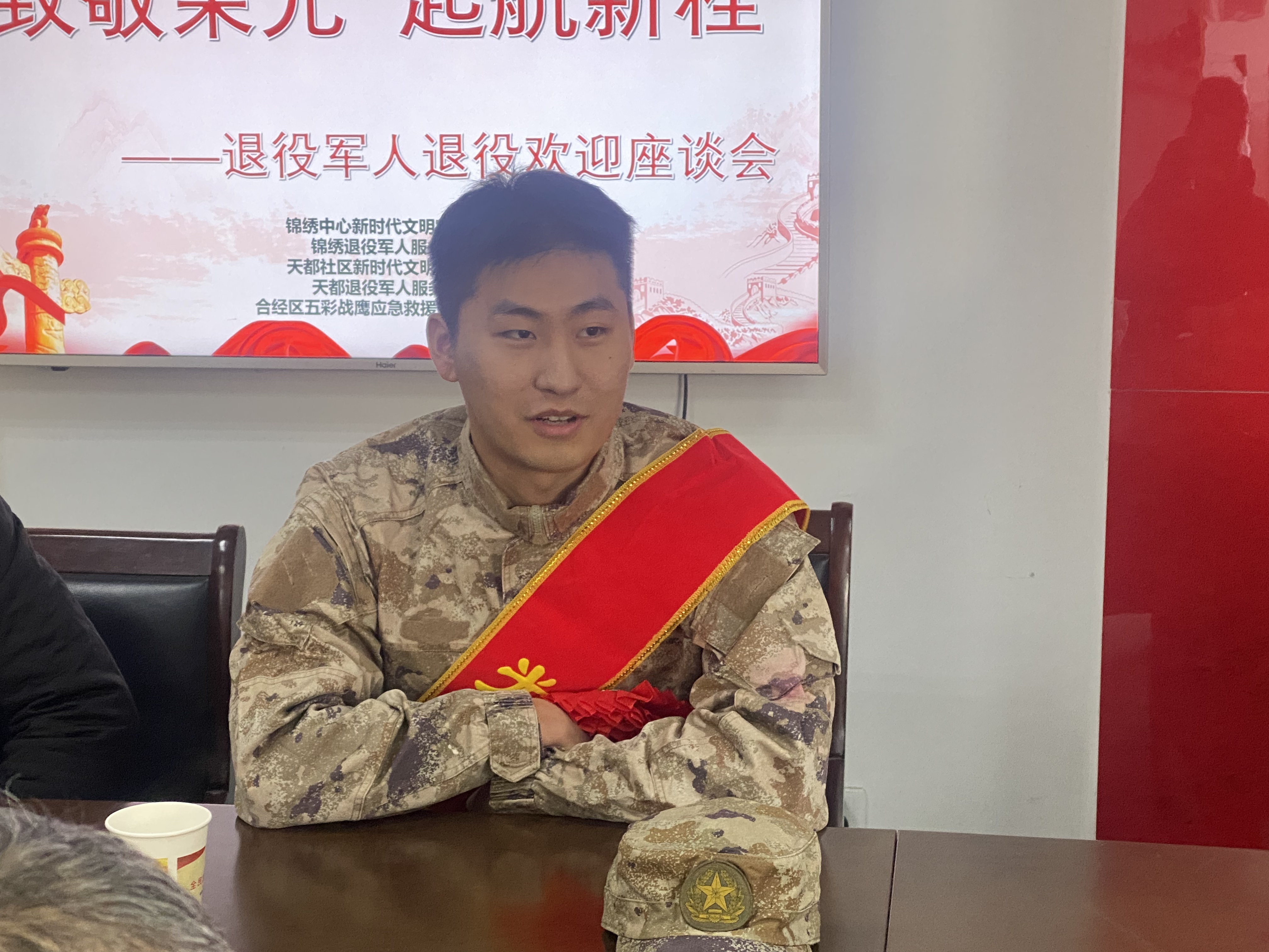 为切实做好退役军人服务保障工作,向退役军人致以崇高敬意并助力其顺利融入社会,12月5日,合肥经开区锦绣中心新时代文明实践所、锦绣退役军人服务站、天都社区新时代文明实践站、天都退役军人服务站、合经区五彩战鹰应急救援志愿服务队联合开展“致敬荣光,启航新程——退役军人退役欢迎座谈会”活动,让退役军人感受到“回家”的温暖。