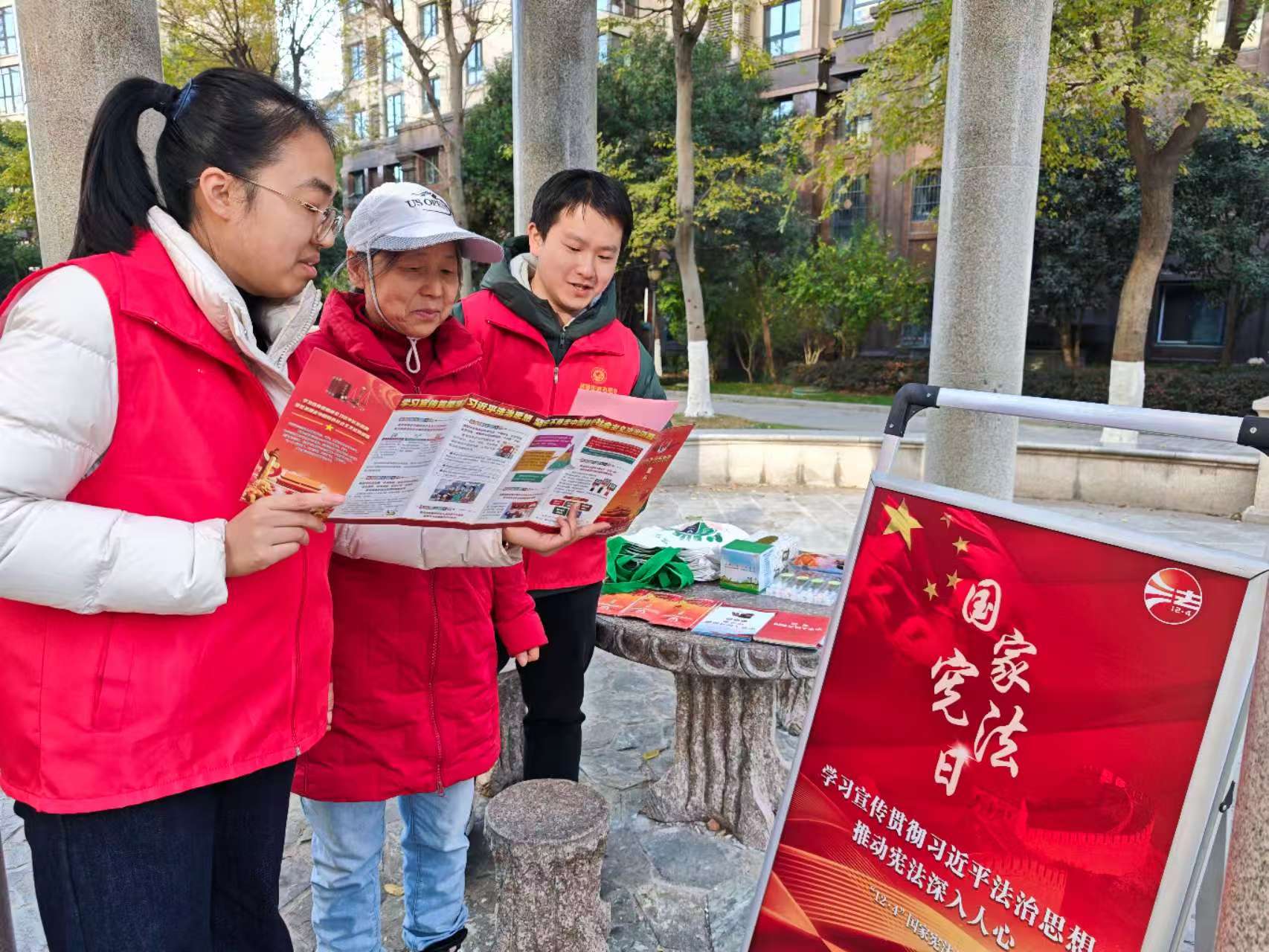 宣誓仪式结束后,户外宪法宣传活动同步开展。社区在小区法治宣传亭设置了宪法知识咨询台,为居民提供免费法律咨询服务。妇联专干和志愿者通过发放法治宣传手册、环保袋,向过往居民普及宪法基本原则、公民基本权利与义务、婚姻家庭、邻里纠纷调解等与日常生活密切相关的法律知识。针对老年人、妇女、青少年等重点群体,志愿者们用通俗易懂的语言讲解宪法核心内容,解答大家在财产继承、权益保护等方面的疑问,引导居民学会运用宪法和法律维护自身合法权益。活动现场还设置了宪法知识互动问答环节,居民们踊跃参与、积极抢答,在轻松的氛围中加深了对宪法知识的理解和记忆。