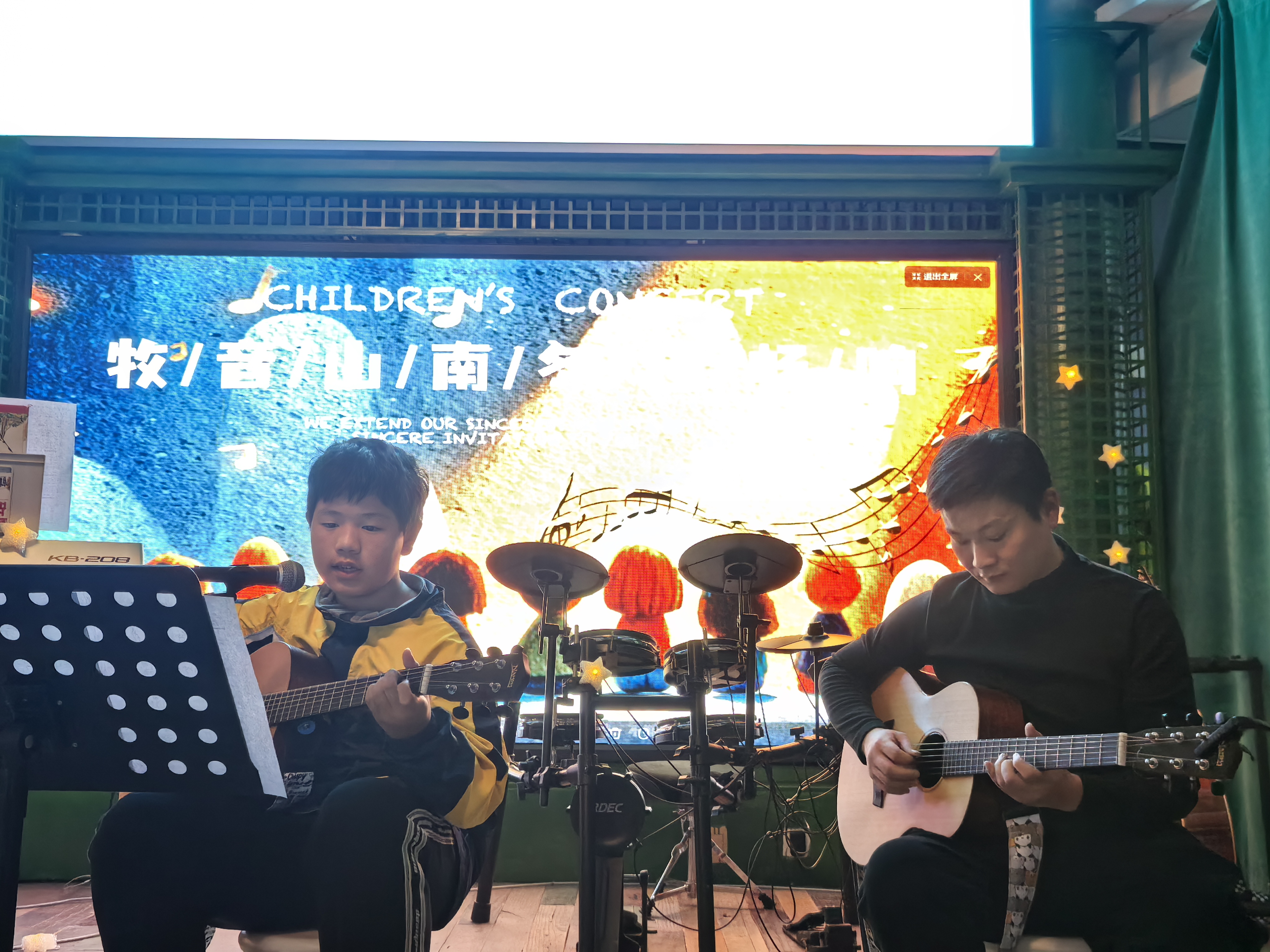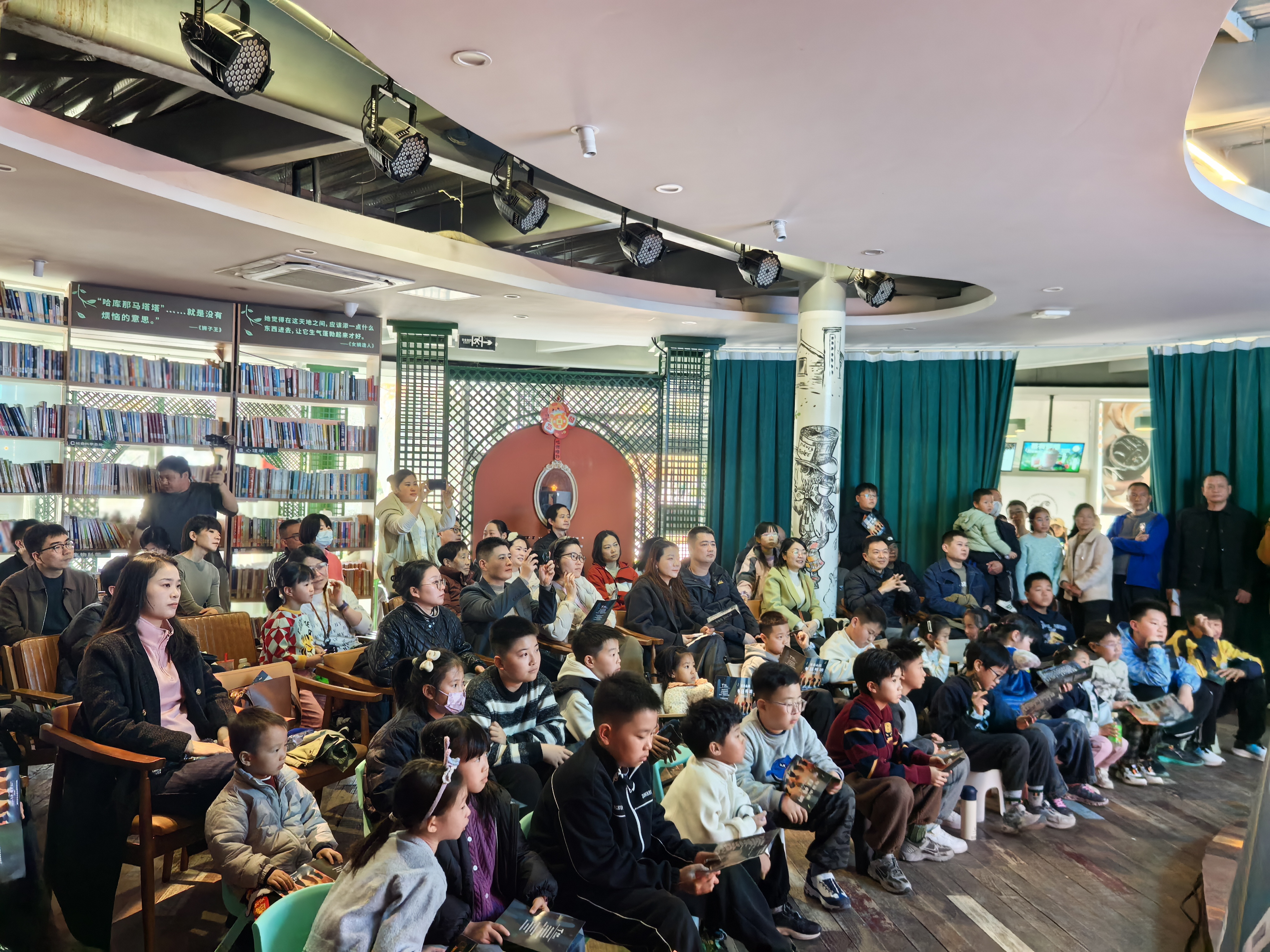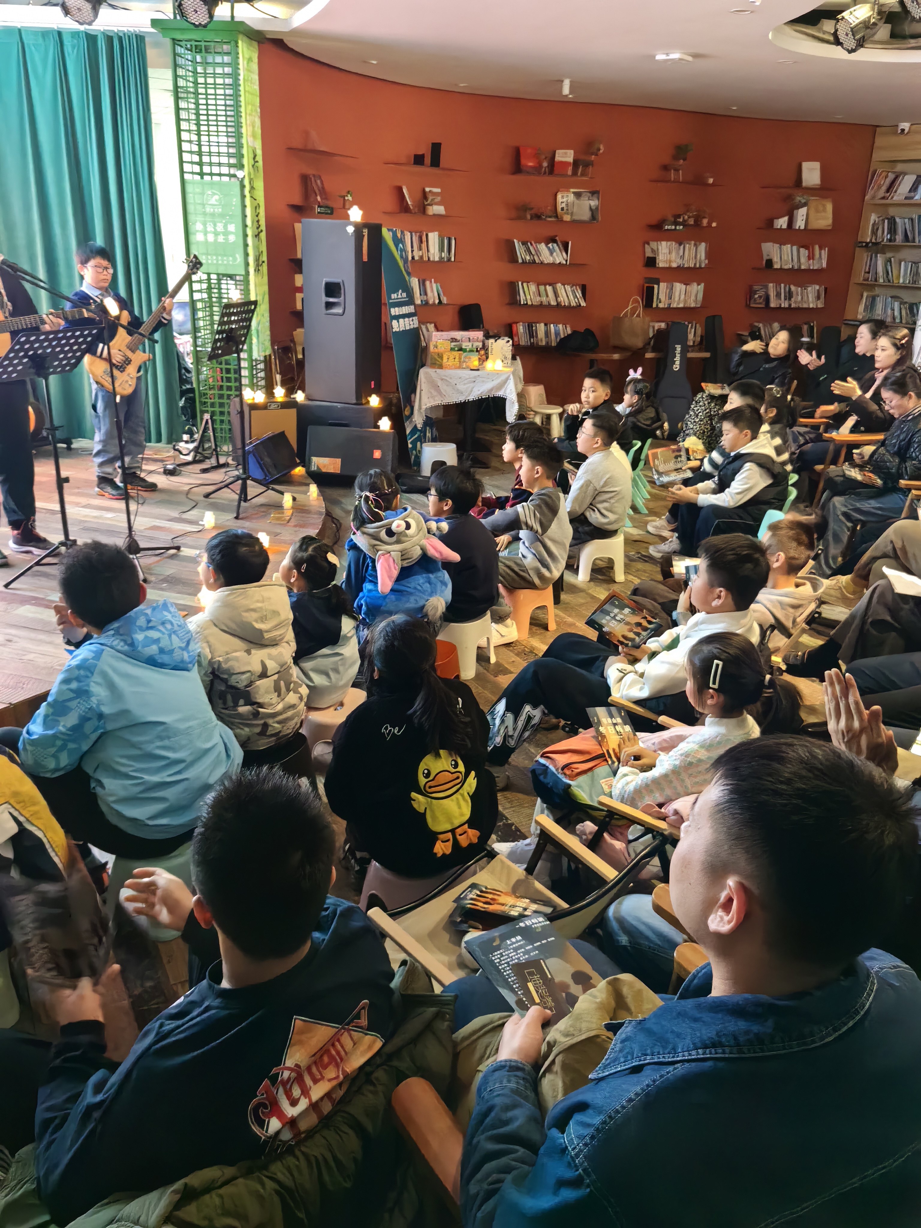 活动当日,绿野书房内暖意融融,来自牧音山南音乐教室的专业教师汪老师及学员组成的演出队伍依次登台。演出曲目风格多元,既有《土耳其进行曲》《红河谷》等经典乐段,也有《我相信》《我们的时光》等治愈系流行曲目,更有小学员带来的童趣满满的尤克里里弹唱和吉他独奏。灵动的旋律在现场流淌,台下观众或凝神静听,或轻声跟唱,不少家庭全家出动,温馨的氛围感染着在场的每一个人。