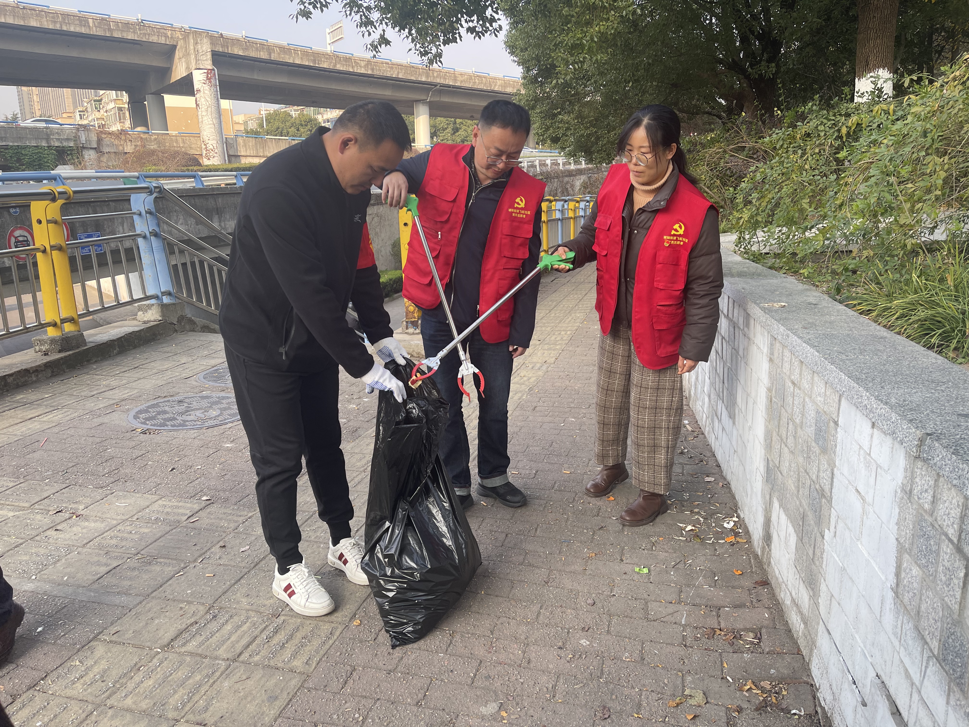 12月10日上午,合肥市蜀山区琥珀街道飞虹社区的青年志愿者们再次集结,火热开展“党群齐心,周周行动”城市精细化管理活动。这次的目标是五里墩立交桥东北角的飞虹园——志愿者们化身“环境小卫士”,专注清理路面漂浮物,还要把乱停乱放的非机动车“归归位”。