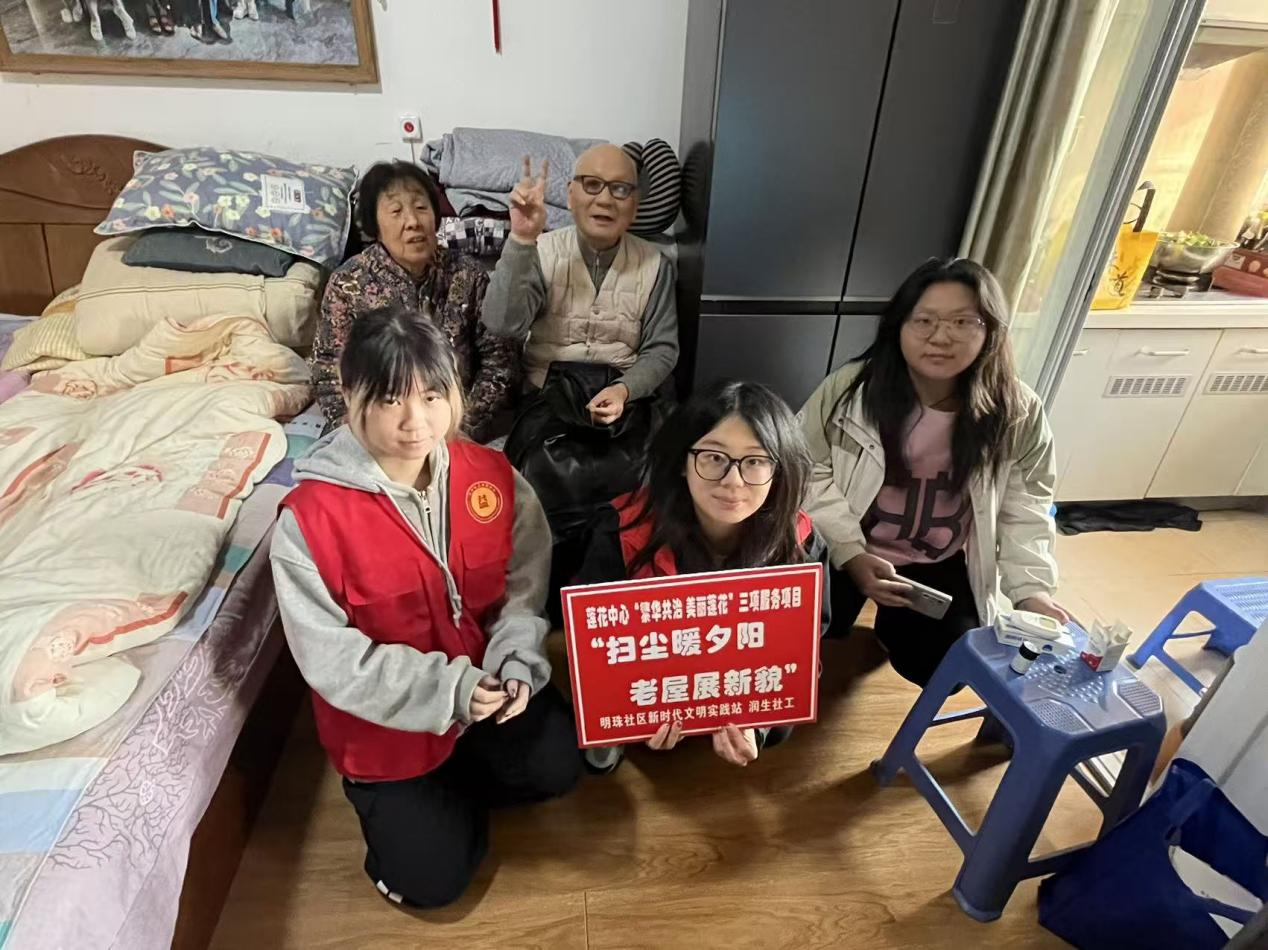 活动当天,30余名大学生志愿者与工作人员组成10支服务小队,每组由1名工作人员带队,深入社区独居老人家中开展志愿服务。一进门,志愿者们便各司其职、忙而有序:有的细致打扫客厅灰尘,有的耐心整理房间杂物,有的认真擦拭门窗玻璃,还有的为老人测量血压,细致询问身体状况。