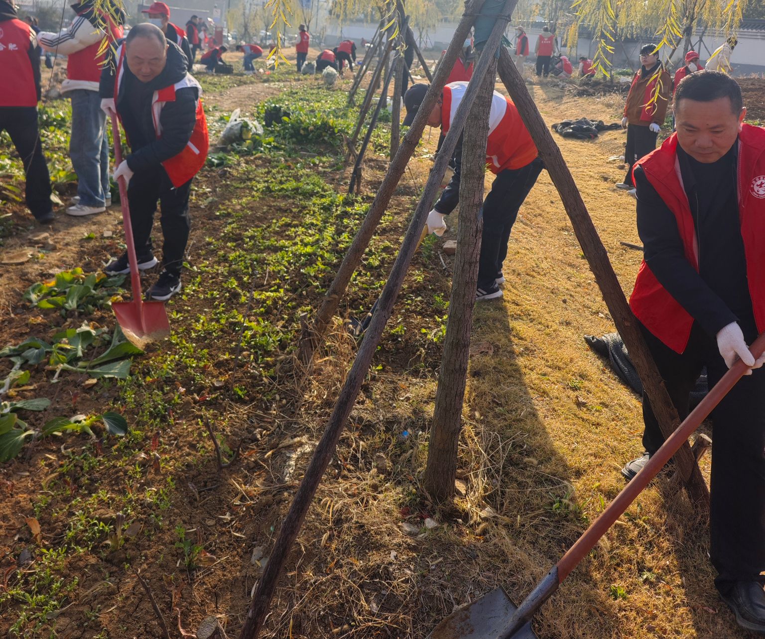 冬日的王建沟畔寒风凛冽,但红色马甲的身影却格外醒目。志愿者们分工协作:有的挥锹铲除菜畦边界;有的搬运清理出的杂物、平整裸露土地;有的拔除违规种植的青菜,划定生态保护区域边界。经过半天的集中攻坚,累计恢复生态用地多亩,清理违规种植的青菜30余袋,原本被分割得支离破碎的绿地重新连成一片,湿地生态用地的自然肌理逐渐凸显。