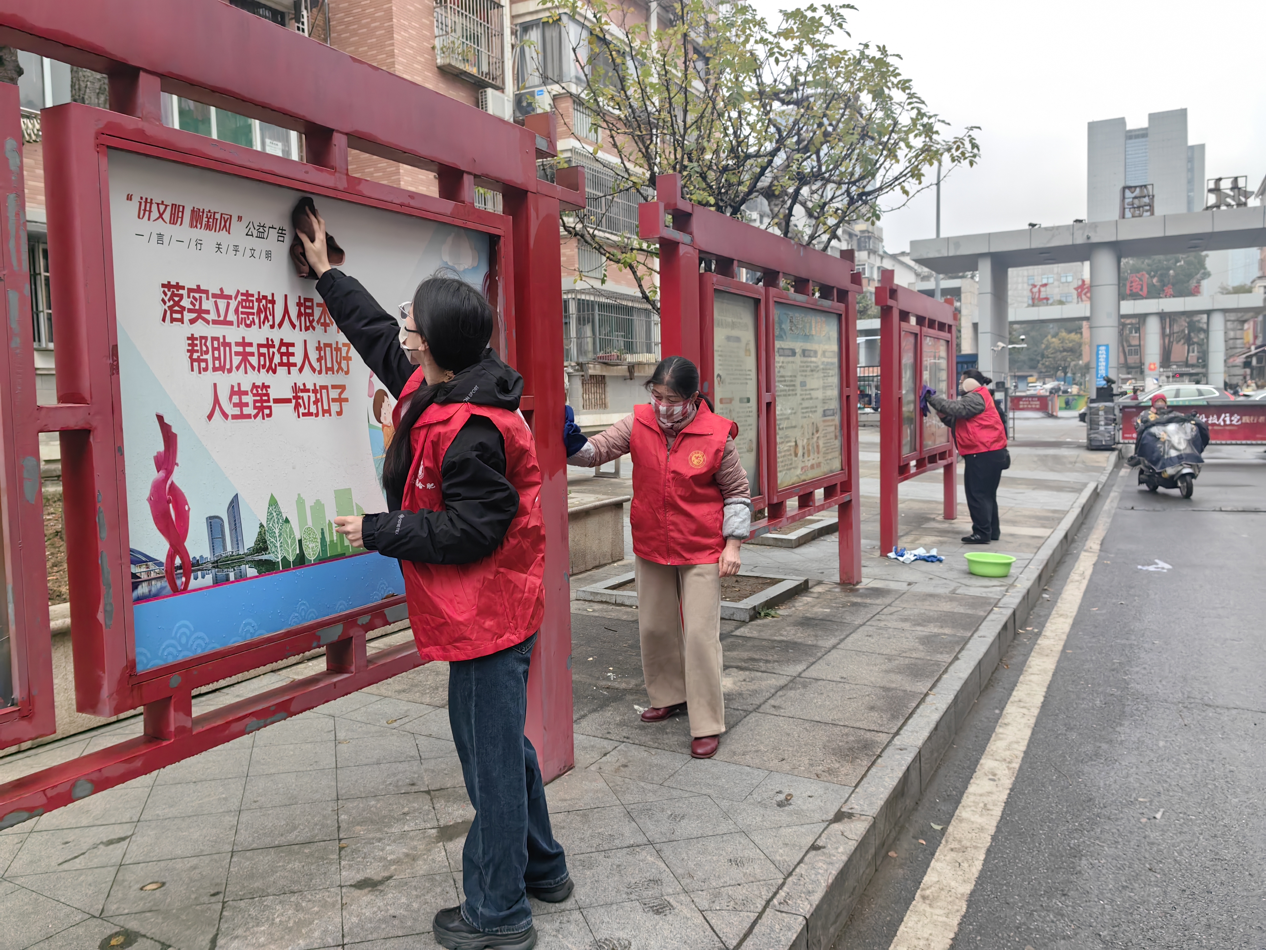 在居民小区治理一线,“周末焕新·环境秩序大提升”志愿服务活动常态化开展,成为改善人居环境的重要抓手。社区党委聚焦汇林阁小区居民反映强烈的民生痛点,针对楼道杂物堆积、宣传栏脏污破损、非机动车乱停乱放等“顽疾”,组织志愿者开展全覆盖集中整治。身着红马甲的志愿者们分组行动,爬楼梯、清楼道、擦橱窗、理车辆,不放过任何卫生死角。此次行动全面覆盖小区27个楼栋、100个单元,通过精细化清理与规范化管理,原本杂乱的楼道变得通畅整洁,斑驳的宣传栏焕发新颜,无序停放的车辆归位成行,居民家园的“颜值”与“内涵”同步提升。