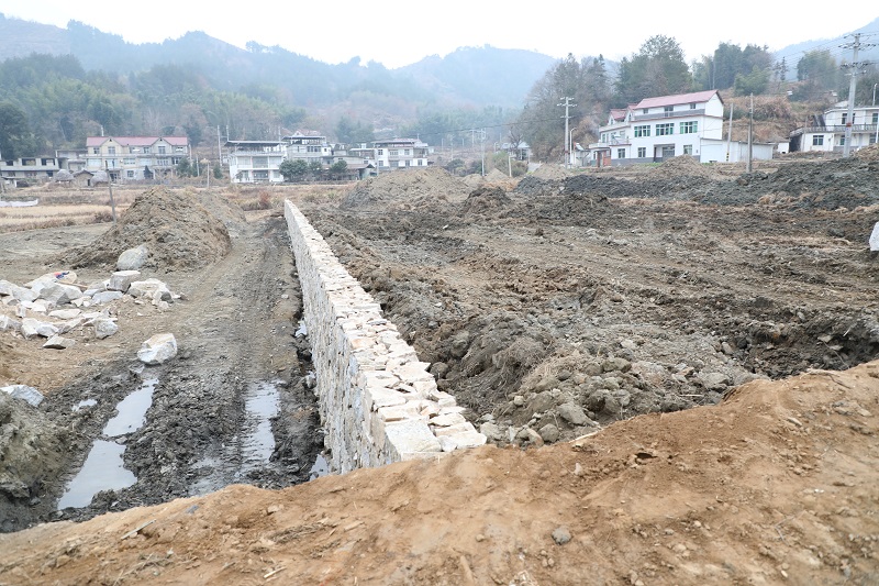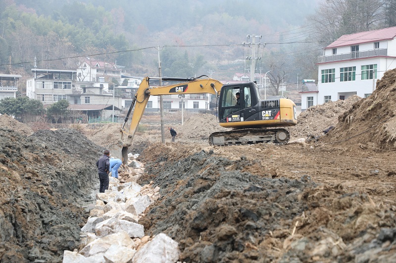 12月16日,岳西县五河镇沙岭村的高标准农田建设现场呈现一派繁忙景象。挖掘机挥舞长臂正在进行土地平整,施工人员正加紧修筑沟渠。