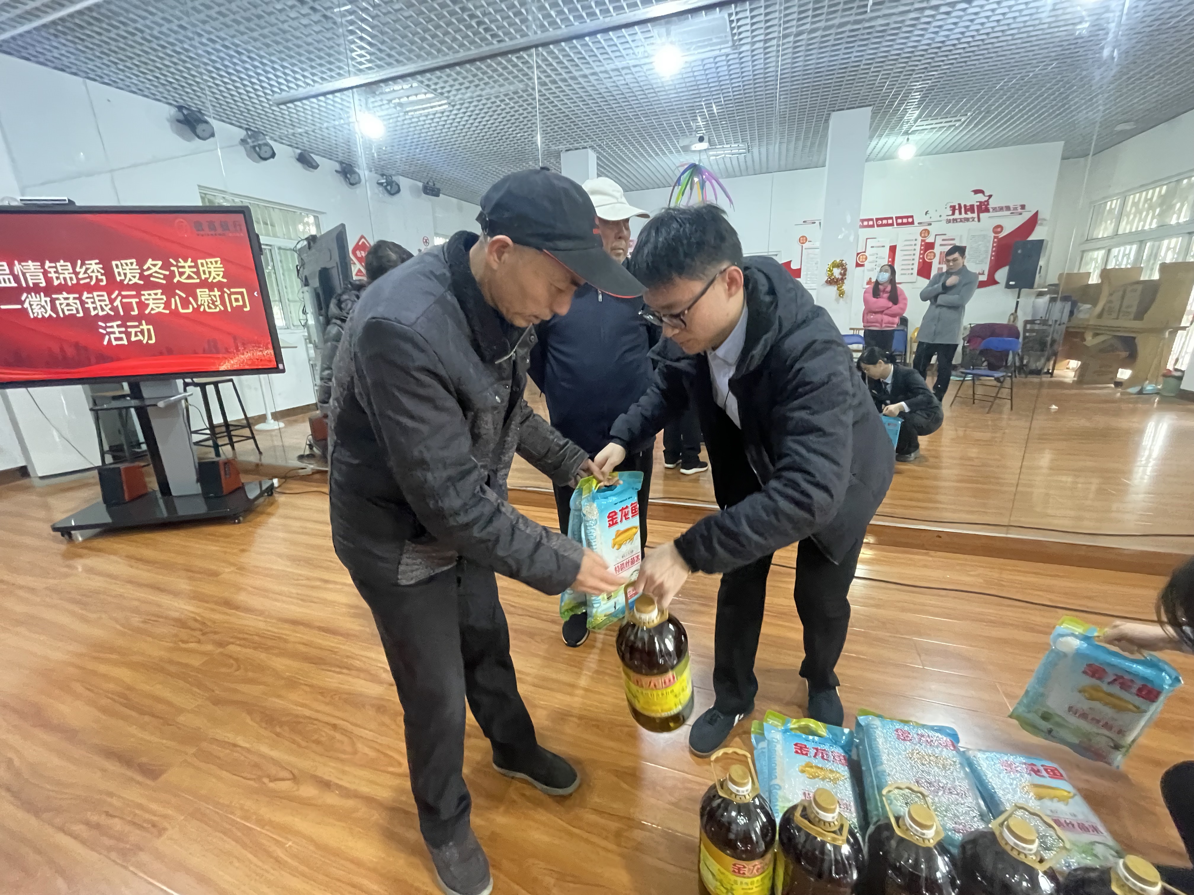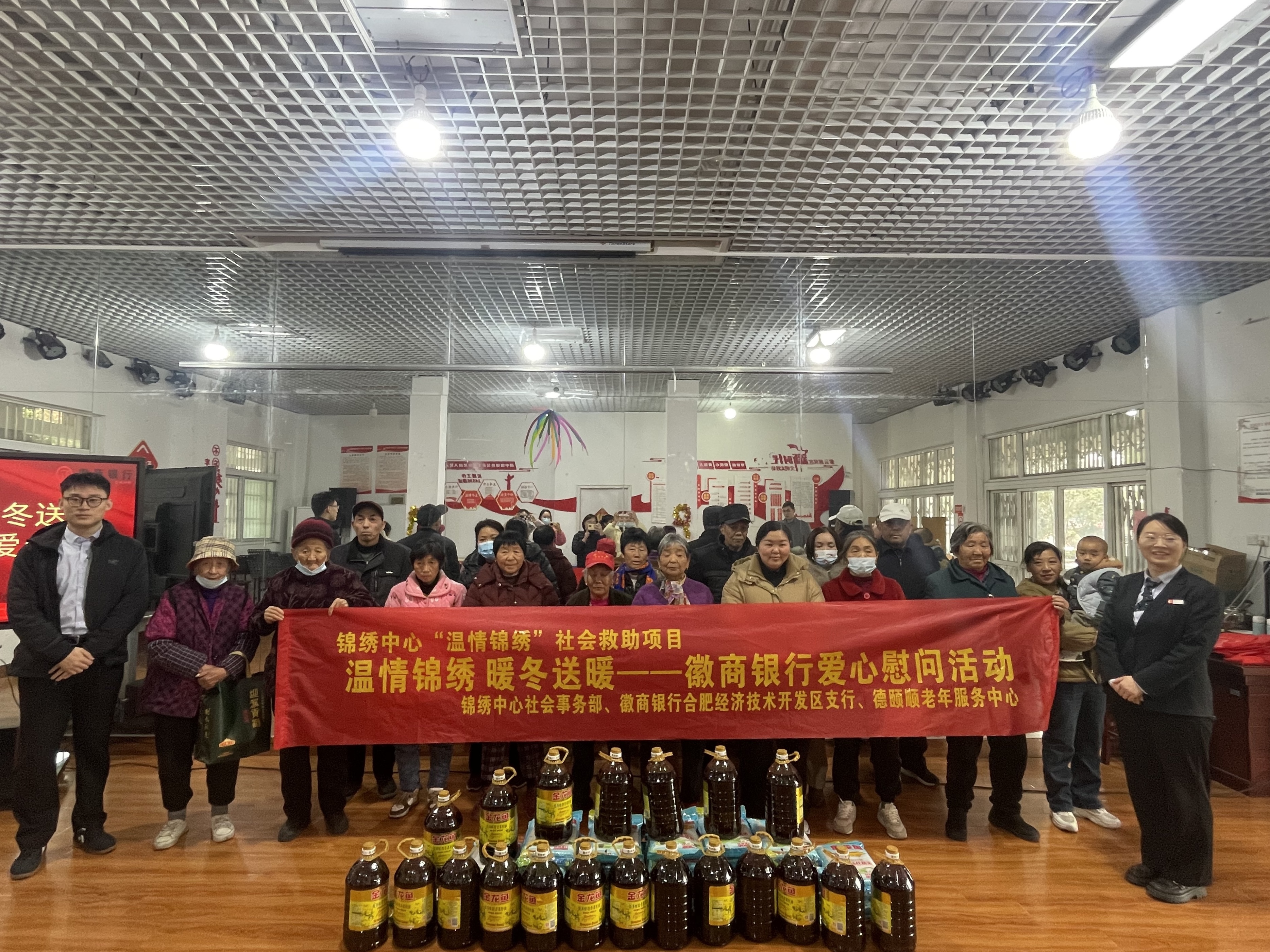 寒冬时节,暖意先行。为切实缓解辖区困难群众的生活难题,积极实施30项民生实事,增进民生福祉,让群众感受到政府与社会的关怀,12月19日,锦绣中心社会事务部联合德颐顺老年服务中心,携手爱心单位徽商银行合肥经济技术开发区支行,走进锦绣辖区紫云活动室开展温情锦绣 暖冬送暖——徽商银行爱心慰问活动,为20户困难家庭送上价值约3000元的米、油等生活物资,将冬日温暖送到群众心坎上。