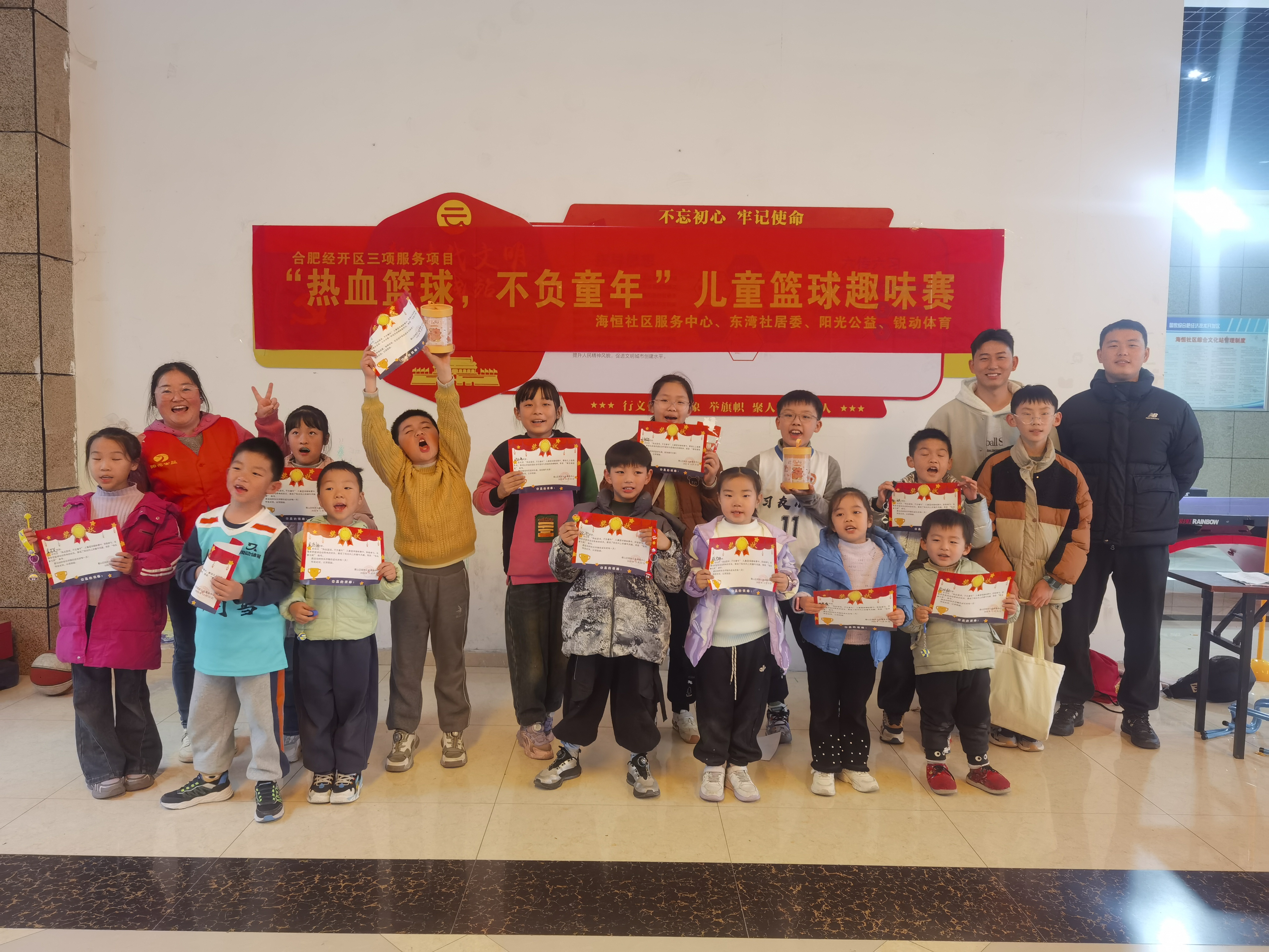 为丰富社区儿童课余生活,弘扬体育运动精神,营造和谐邻里氛围,12月20日,合肥经开区海恒社区服务中心、东湾社居委联合蜀山区阳光公益服务中心、锐动体育共同举办的 “热血篮球,不负童年”儿童篮球趣味赛在御湖观邸小区活动中心欢乐开赛。来自辖区的 20 名 5-12 岁儿童齐聚一堂,在篮球运动中释放活力、收获成长。