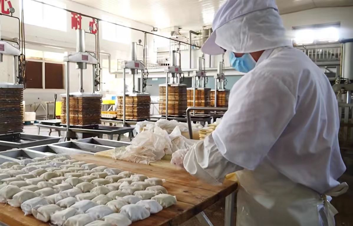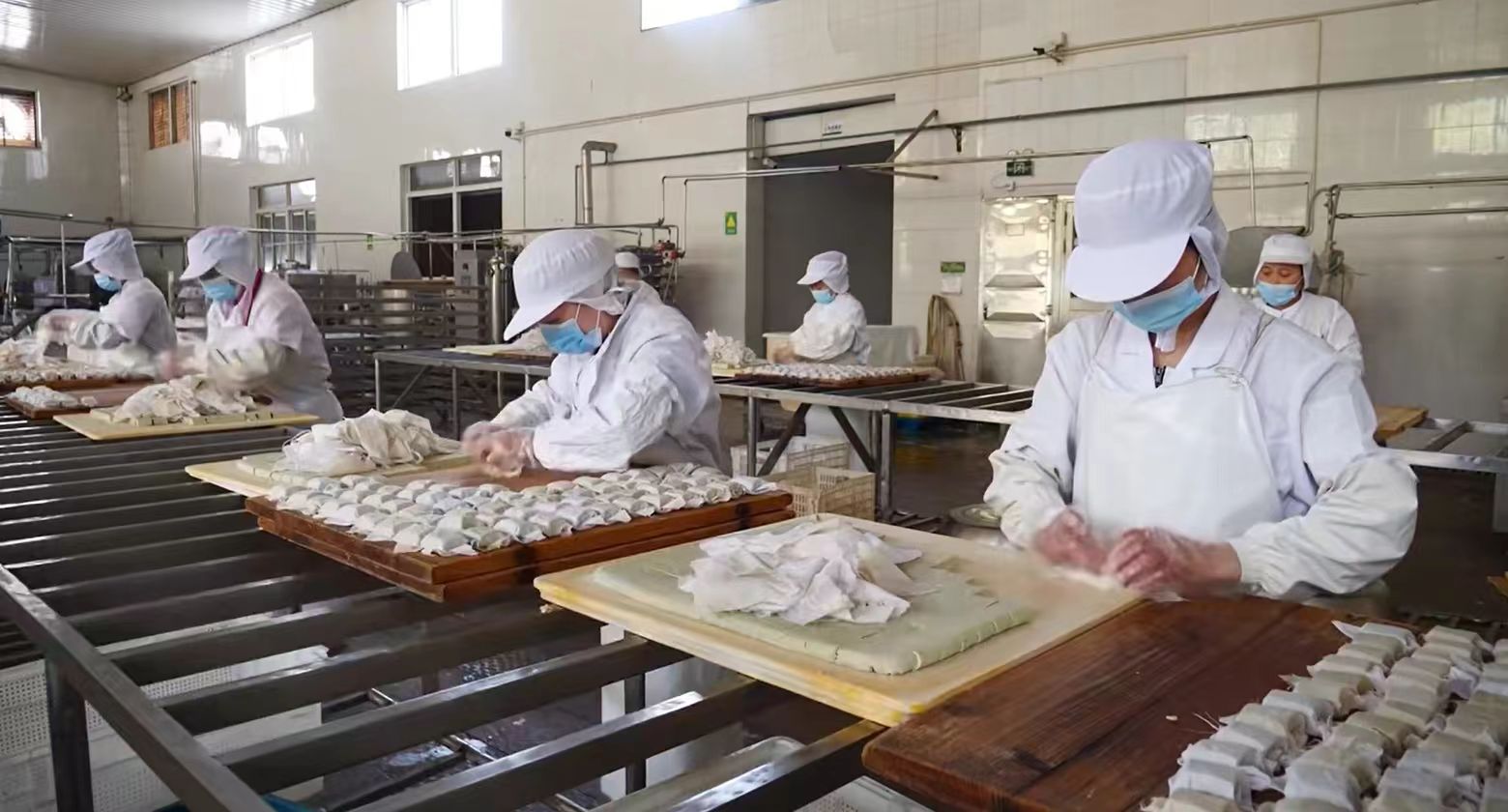 在五城镇龙湾村峰味豆制品厂里,豆香四溢,热气蒸腾,员工们正忙着将已经浸泡了一夜的黄豆加工成当地的特色豆干。