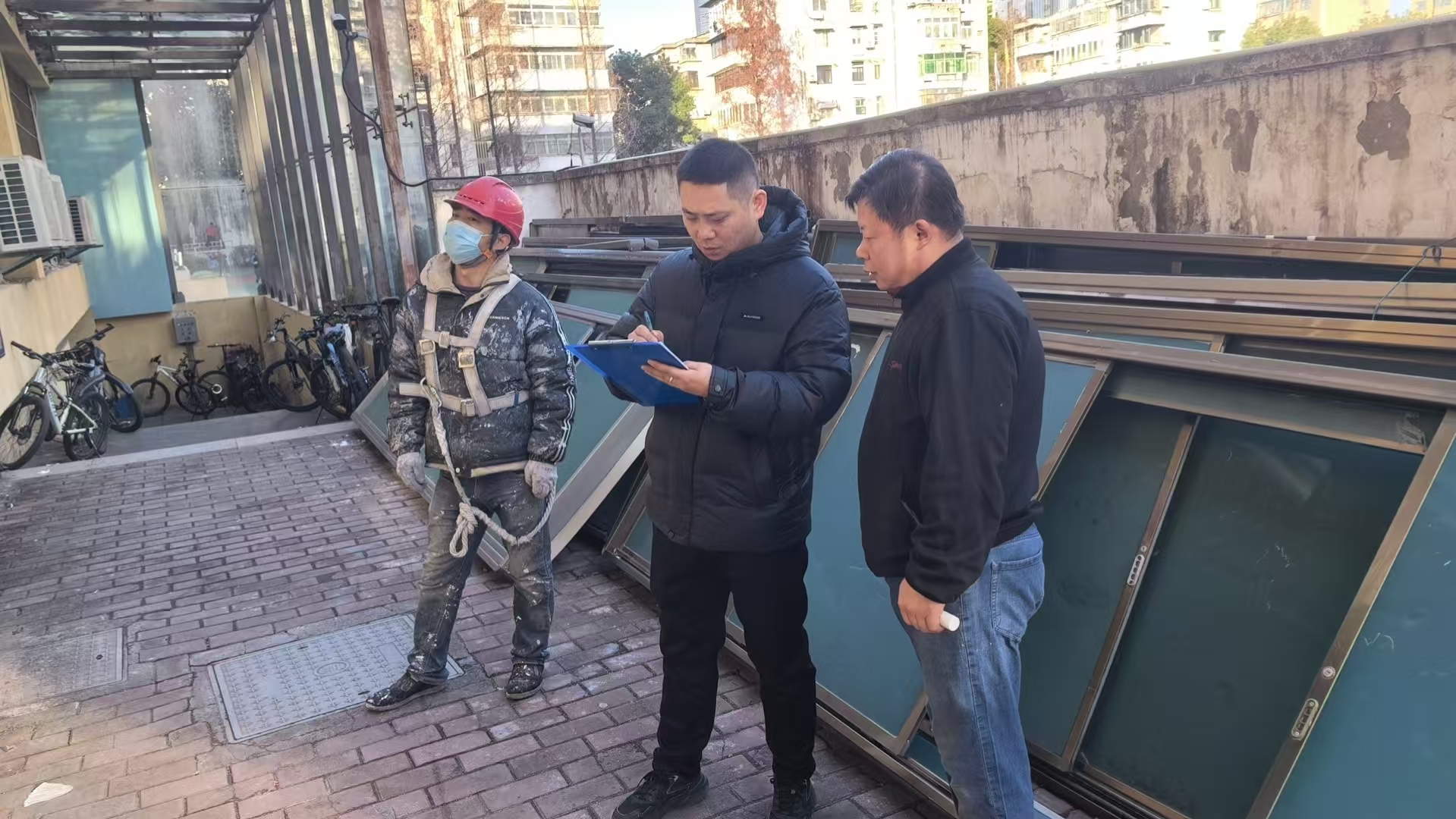 社区工作人员联合学校相关负责人开展现场检查,详细核查脱落范围、隐患程度,记录墙面状况。同时,社区主动协助学校高效完成施工维护备案登记手续,张贴“两书一表”明确施工安全规范与进度节点。