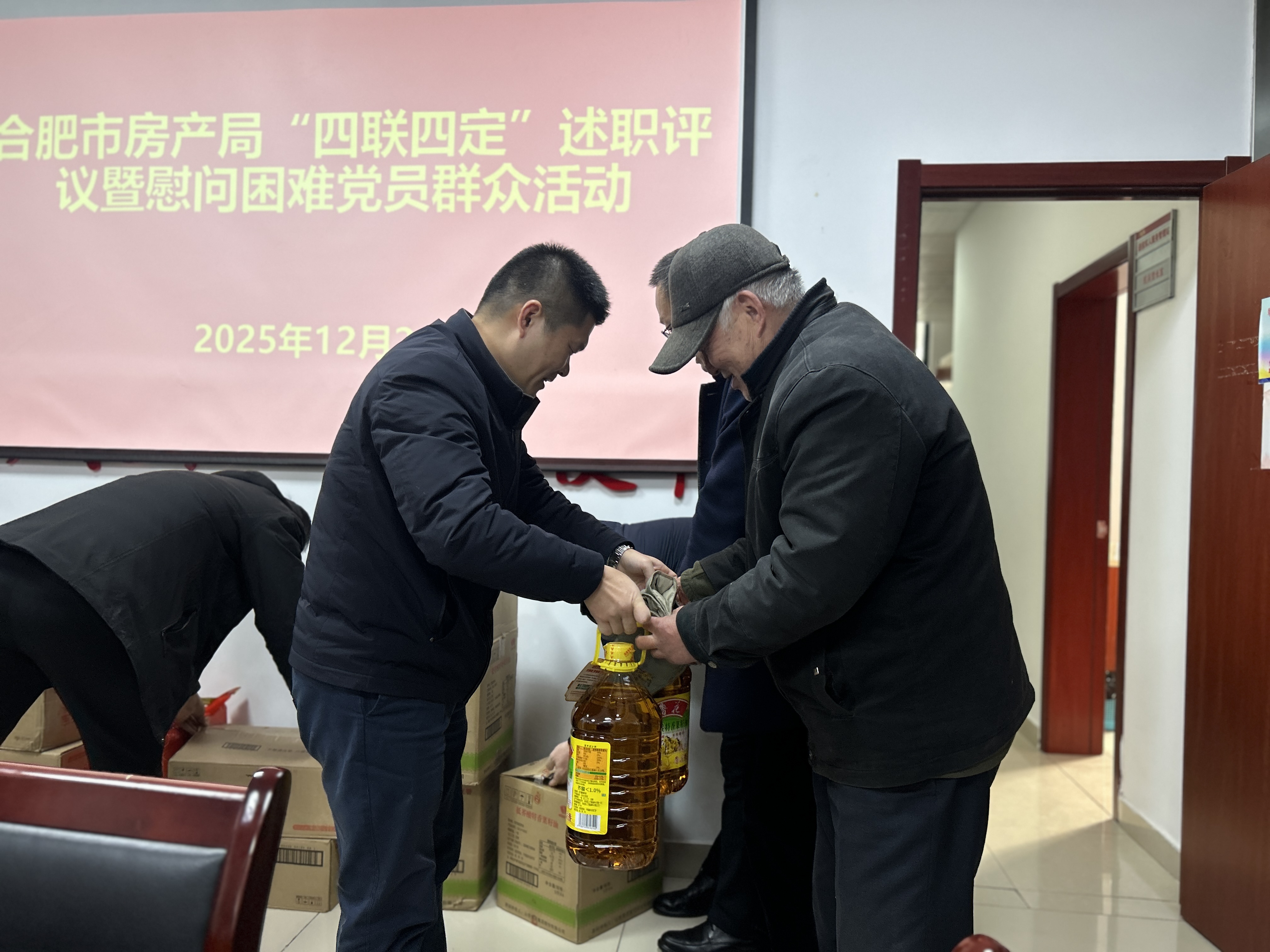 为深入推进基层服务型党组织建设,扎实深化 “四联四定” 工作成效,进一步密切党群干群联系、提升党建共建水平,12月26日下午,合肥市住房保障和房产管理局一行赴翠竹园社区,联合开展2025年度“四联四定”工作述职评议暨困难党员群众慰问活动。市房产局副局长彭纯杰、机关党委专职副书记蒋冬平、机关一支部书记关力、市维管中心党支部组织委员周文广,与翠竹园社区工作站站长蔡玉梅及社区党员、群众代表共同出席活动,以党建共建为纽带,凝聚基层治理合力。