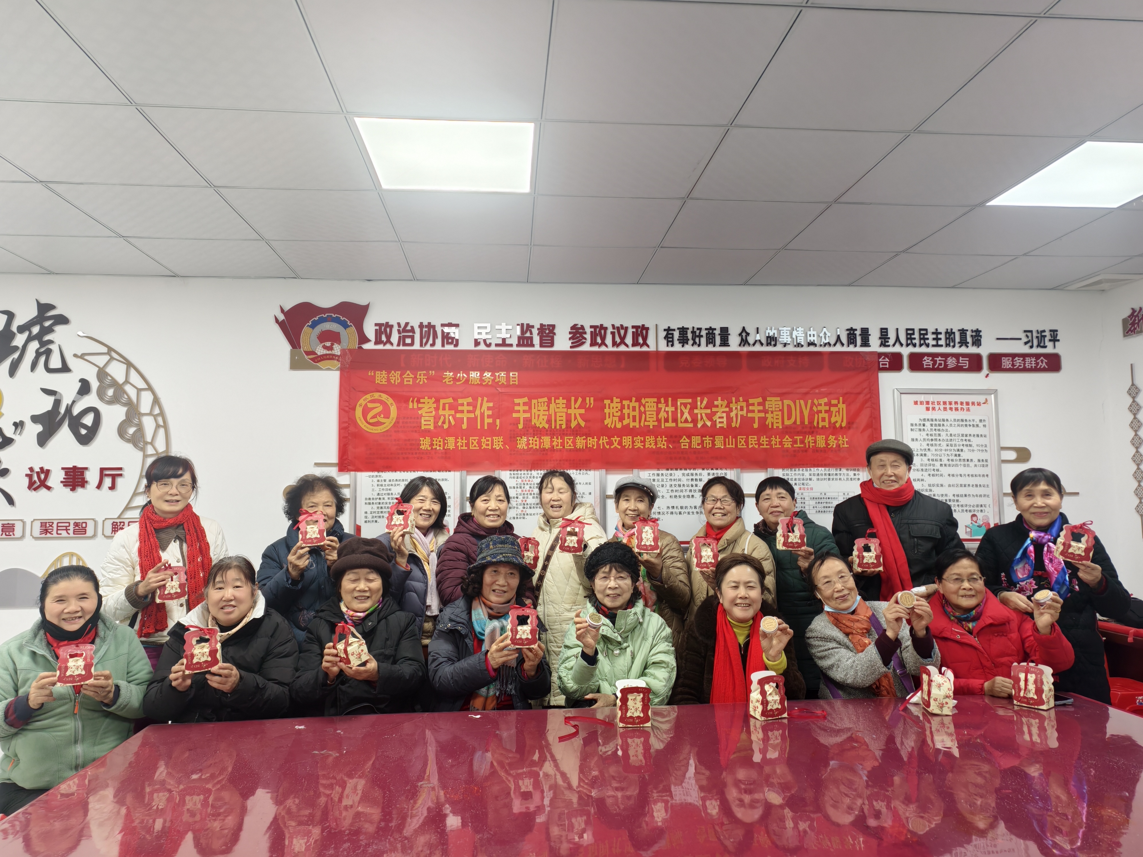 寒冬时节,天干物燥,为丰富辖区老年朋友的精神文化生活,传递社区暖心关怀,近日,依托“睦邻合乐”老少服务项目,合肥市蜀山区琥珀街道琥珀潭社区在一楼活动室开展“耆乐手作,手暖情长”长者护手霜DIY公益活动,18位社区老年居民参与其中,在动手实践中感受手工乐趣与社区温暖。