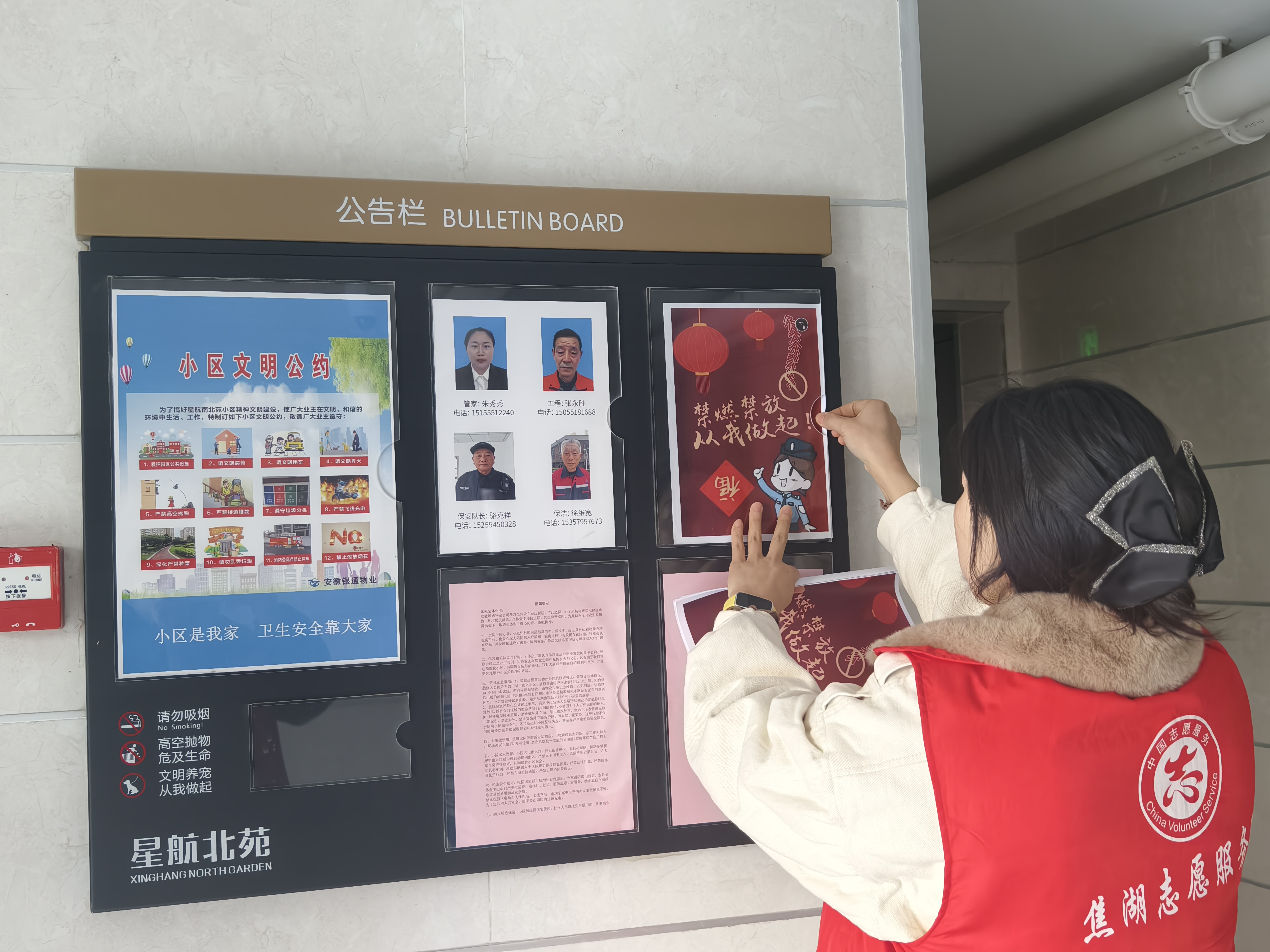 为切实保障辖区居民生命财产安全,减少空气污染,营造平安、整洁、祥和的居住环境,近日,合肥经开区高刘街道焦湖社区新时代文明实践站在星航北苑小区开展“禁止燃放烟花爆竹”主题宣传活动,通过多渠道、全方位的宣传方式,让禁放理念深入人心,推动形成全民参与、共同遵守的禁放氛围。