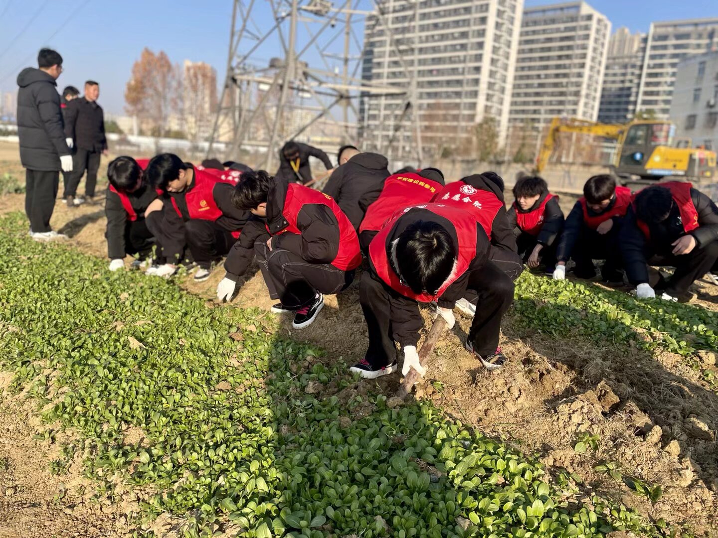 此次行动中,合肥城市管理学校派出的20余名学生志愿者成为一道亮丽的风景线。在党支部党员干部的统筹安排下,他们身着志愿服装,排着整齐的队伍,迈着坚定的步伐穿梭在菜田间,分工协作、相互配合,有条不紊地开展清理工作。尽管田间泥土湿滑,劳动强度不小,但学生志愿者们毫无怨言,以饱满的热情和认真负责的态度,将责任区域内的菜田清理得干干净净,充分展现了当代青年志愿者的责任与担当。