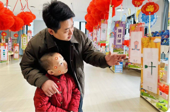 “观灯解谜”区域暖意浓浓,红彤彤的灯笼下挂满了五彩斑斓的谜底纸条。家长和孩子头挨着头、肩并着肩,细细琢磨谜题,时而低声探讨线索,时而灵光一闪道出答案,在亲子协作解谜过程中,尽情感受文字的妙趣与思维的碰撞。“同心接福”游戏格外考验亲子默契。孩子踮脚尖将沙包高高抛起,家长眼疾手快调整篮筐位置,当沙包稳稳落入筐中的瞬间,亲子间的笑容比冬日暖阳还要灿烂,默契与爱意在这一刻悄然升温。
