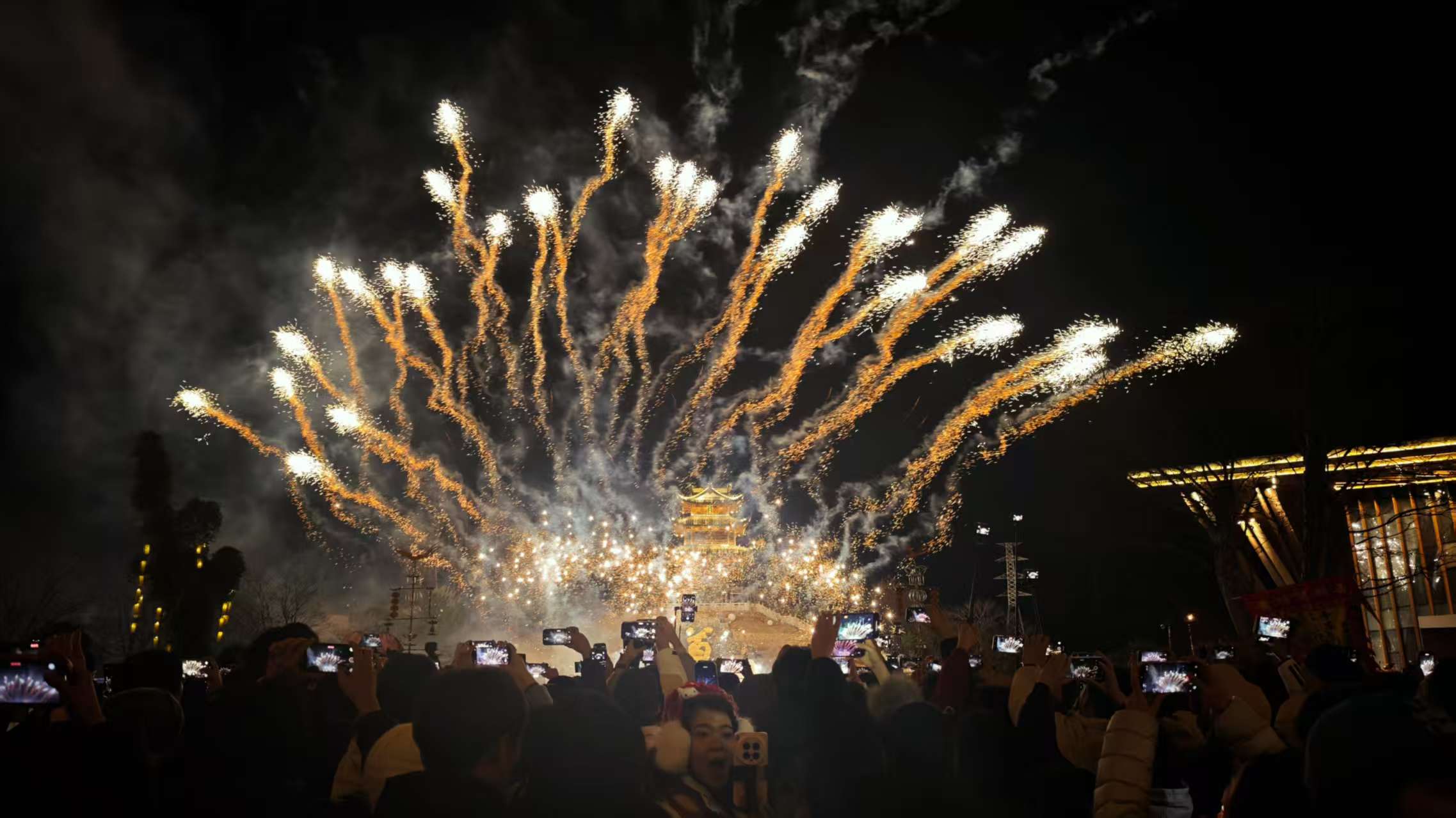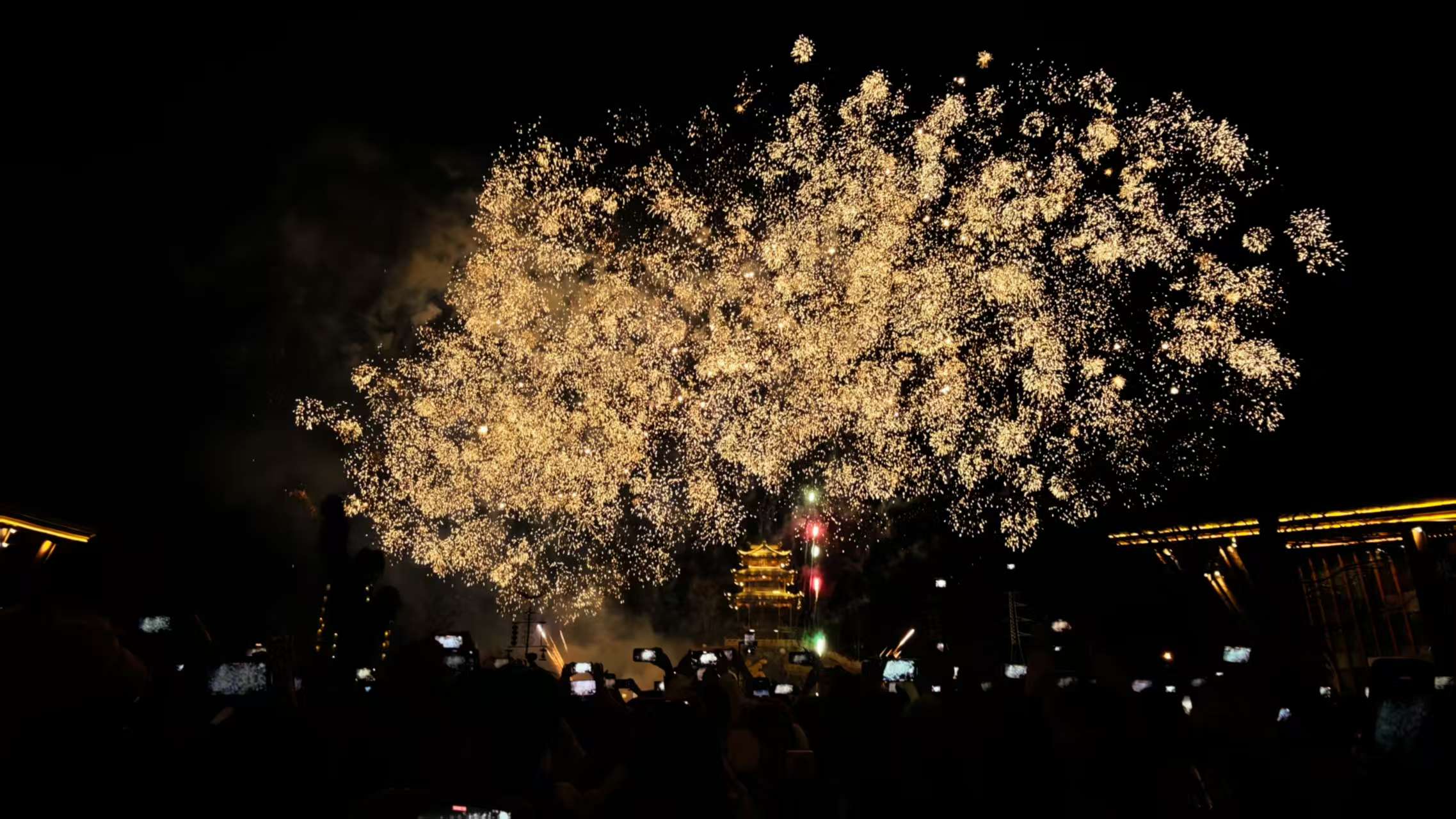 在呐喊声中,“逍遥齐云”舞台上,火壶演艺、齐云打铁花等节目缤纷上演,数百朵烟花齐放夜空,演绎出七彩祥云、五谷丰登、垂瀑烟花等样式,斑斓的焰火勾勒出齐云山的轮廓,七彩的光芒映照着游客们喜悦的脸庞。而新引入的麒麟舞、药发木偶等多项国家级非遗项目成为当晚的主角。药发木偶,是一种绽放于夜间的“火中木偶戏”,夜幕之下,两只十几米的竹竿巍然耸立,层层装置的烟花轮与木偶盒在引线的带动下,只听“嗖”的一声,烟花轮喷薄出耀眼星雨,同时,身披彩衣的木偶从盒中倏然弹出,于流光溢彩间凌空起舞、翻腾,在火焰与惊叹声中,演绎一场“东风夜放花千树”的奇幻戏剧。“以前只在古装电视剧中看过,没想到在这里亲身体验到了,太壮观了!”在场的游客无不被这番瑰丽景象所震撼。
