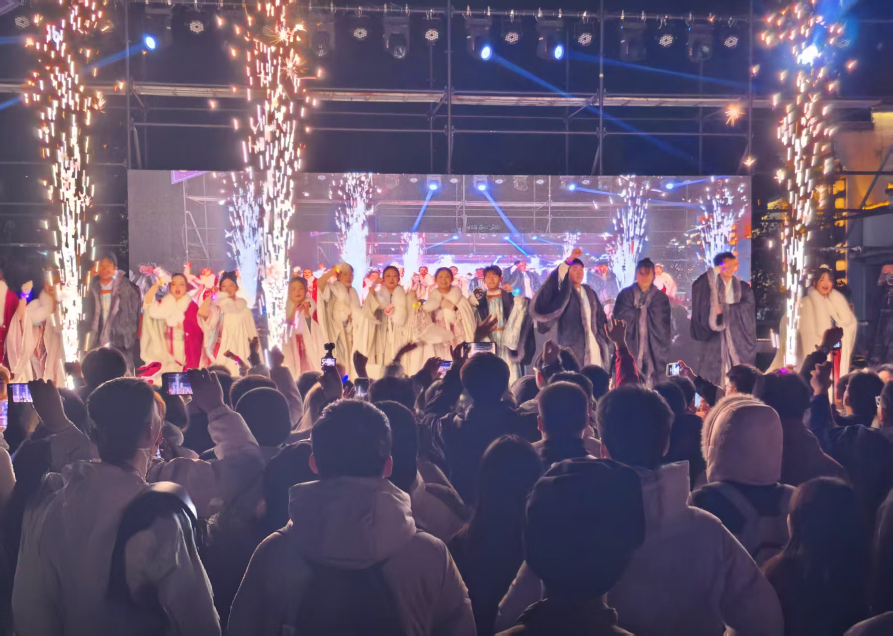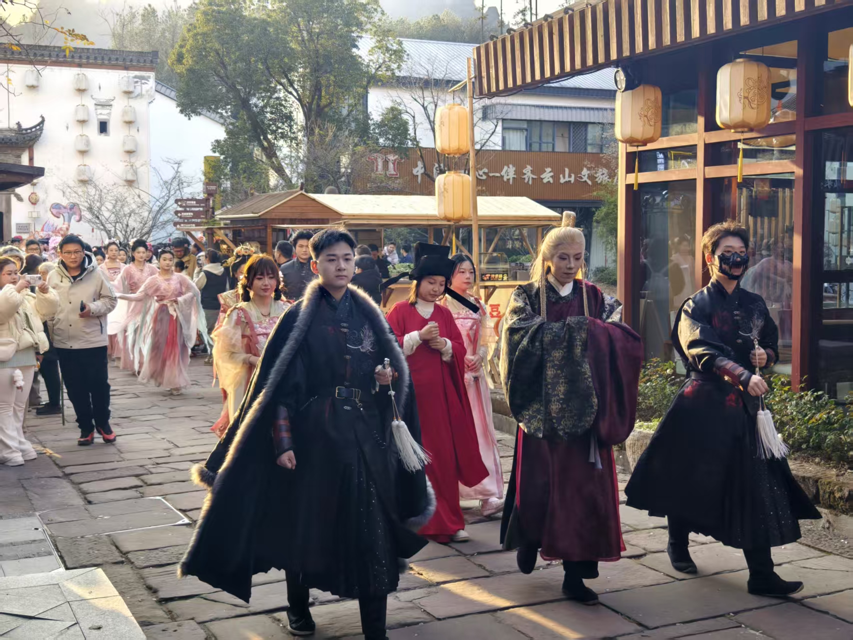 在齐云山景区,演员们头戴高冠,身着彩袍,扮成“财神”和“月老”,为游客们“赐福”,大家围着“天官”合影打卡,参与游戏互动,祝愿在新的一年财源广进、幸福美满。齐云山下,“逍遥仙缘会”活动串联起整个齐云小镇,丰富多彩的演艺场景编织成此起彼伏的欢乐海洋。在“仙侠大会”上,舞蹈、杂技、剑术、快闪等互动表演粉墨亮相;在“快活巷”,游客们参与“当铺典拍”“真人祈福”“鸿运骰坊”等互动游戏,赚取游戏银票;在“逍遥街”和“福海”舞台,20多项古风演艺吸引游客们十步一停留,观看喷火、傩舞、麒麟舞等民俗活动,欣赏“齐云山吟”等歌舞表演,还与“逍遥小师妹”学习剑术,现场热闹非凡。