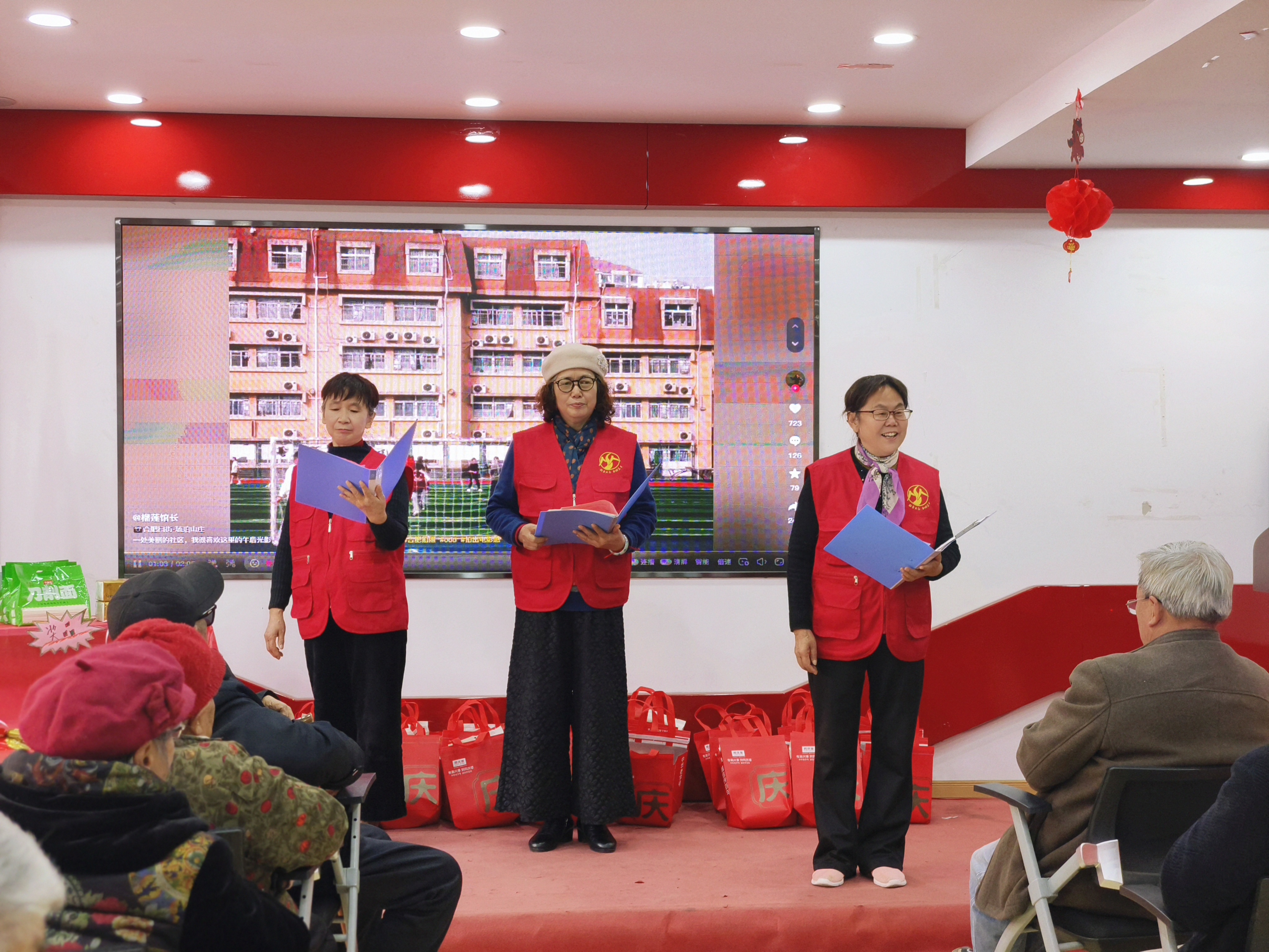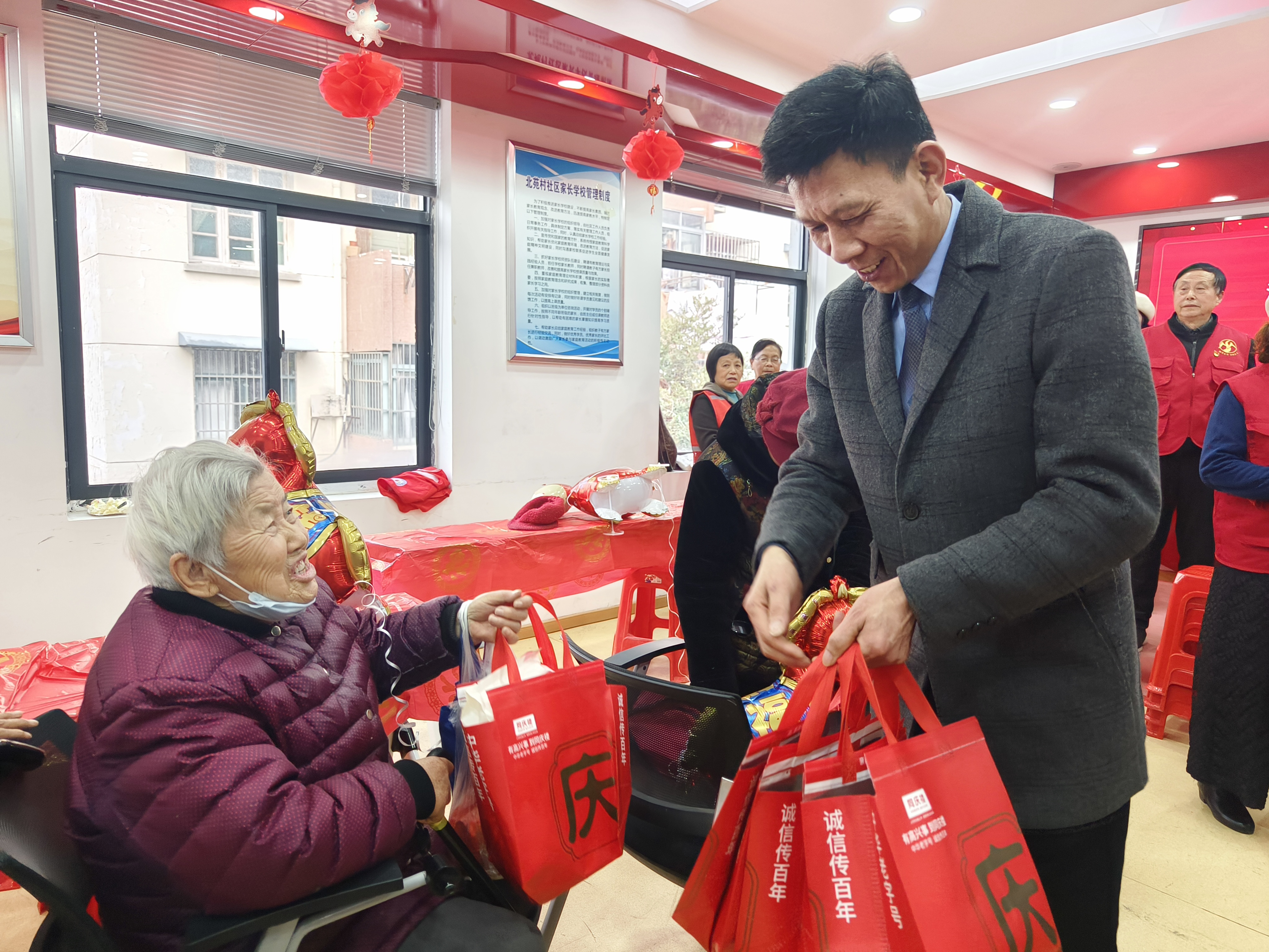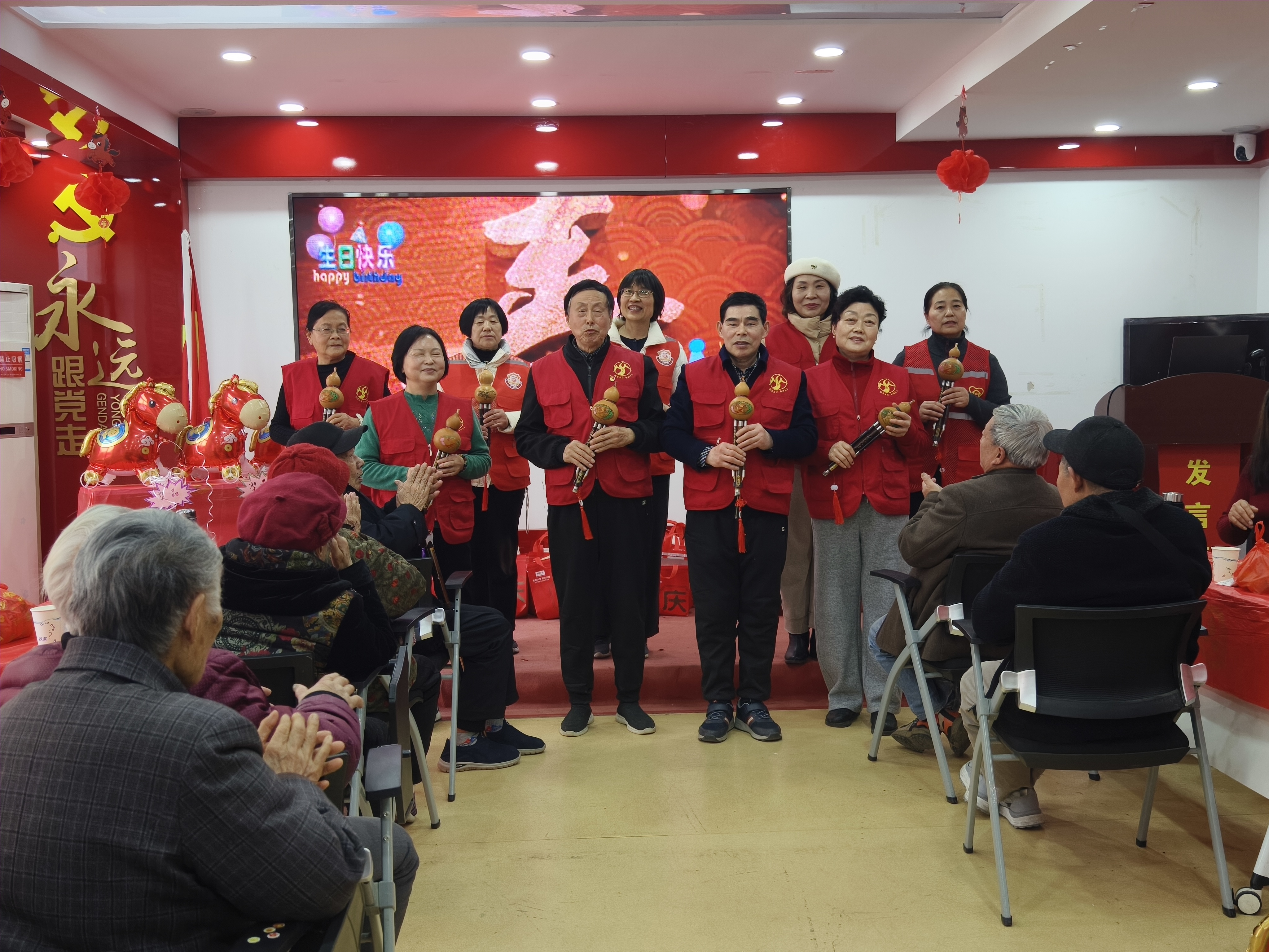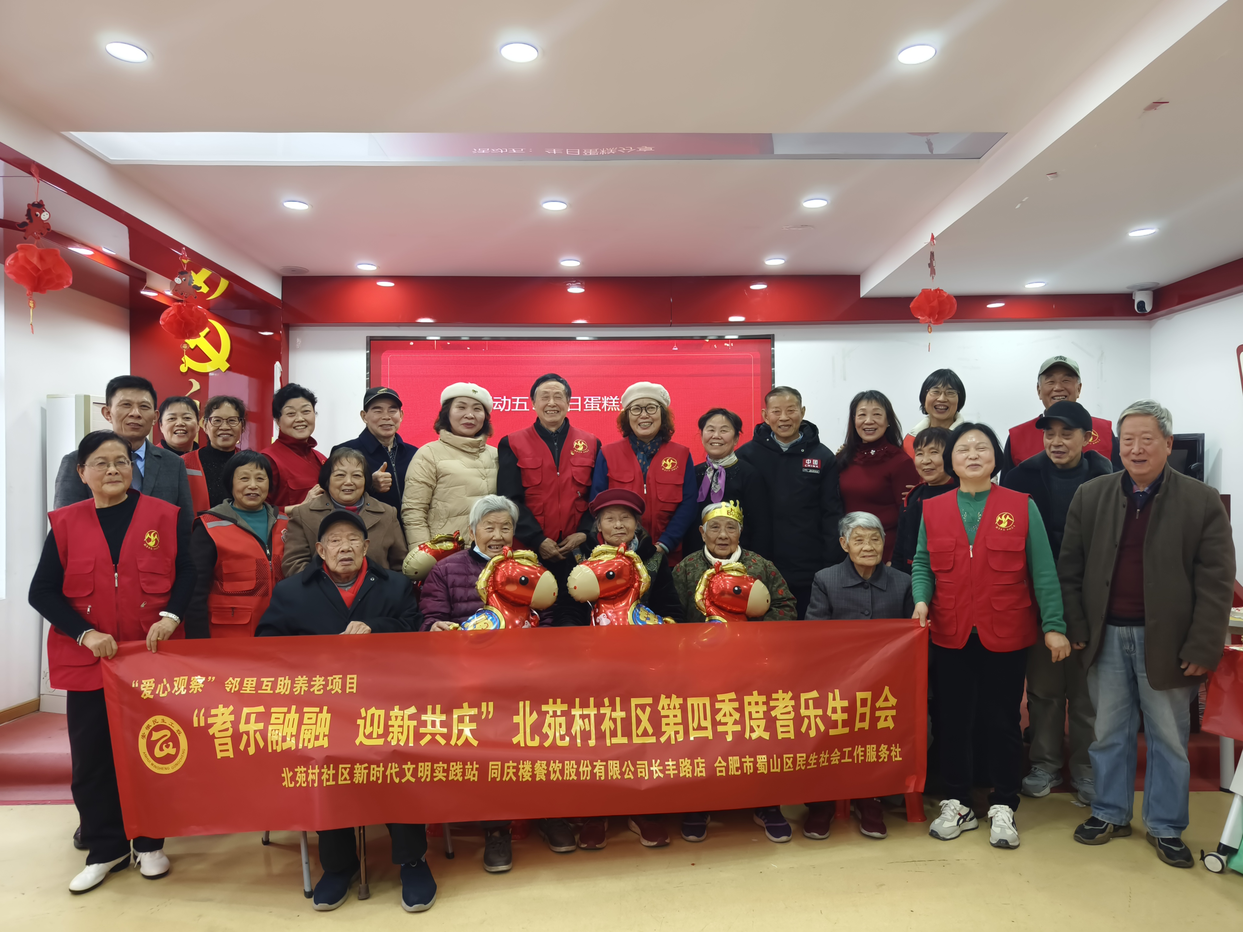日前,合肥市蜀山区琥珀街道北苑村社区活动室内欢声雷动、暖意融融,一场以“耆乐融融·迎新共庆”为主题的第四季度长者生日会在此温情启幕。此次活动秉承党建引领的核心理念,依托“红纽带”党建联盟的强大力量,并融合了“爱心观察”邻里互助养老项目的温情,旨在让社区的长辈们感受到来自社区的深切关怀与温暖。活动得到了同庆楼餐饮股份有限公司长丰路店、合肥市蜀山区民生社会工作社的大力支持与赞助,现场老人及志愿者共计24人参与,大家一同庆祝生辰,喜迎新年的到来。