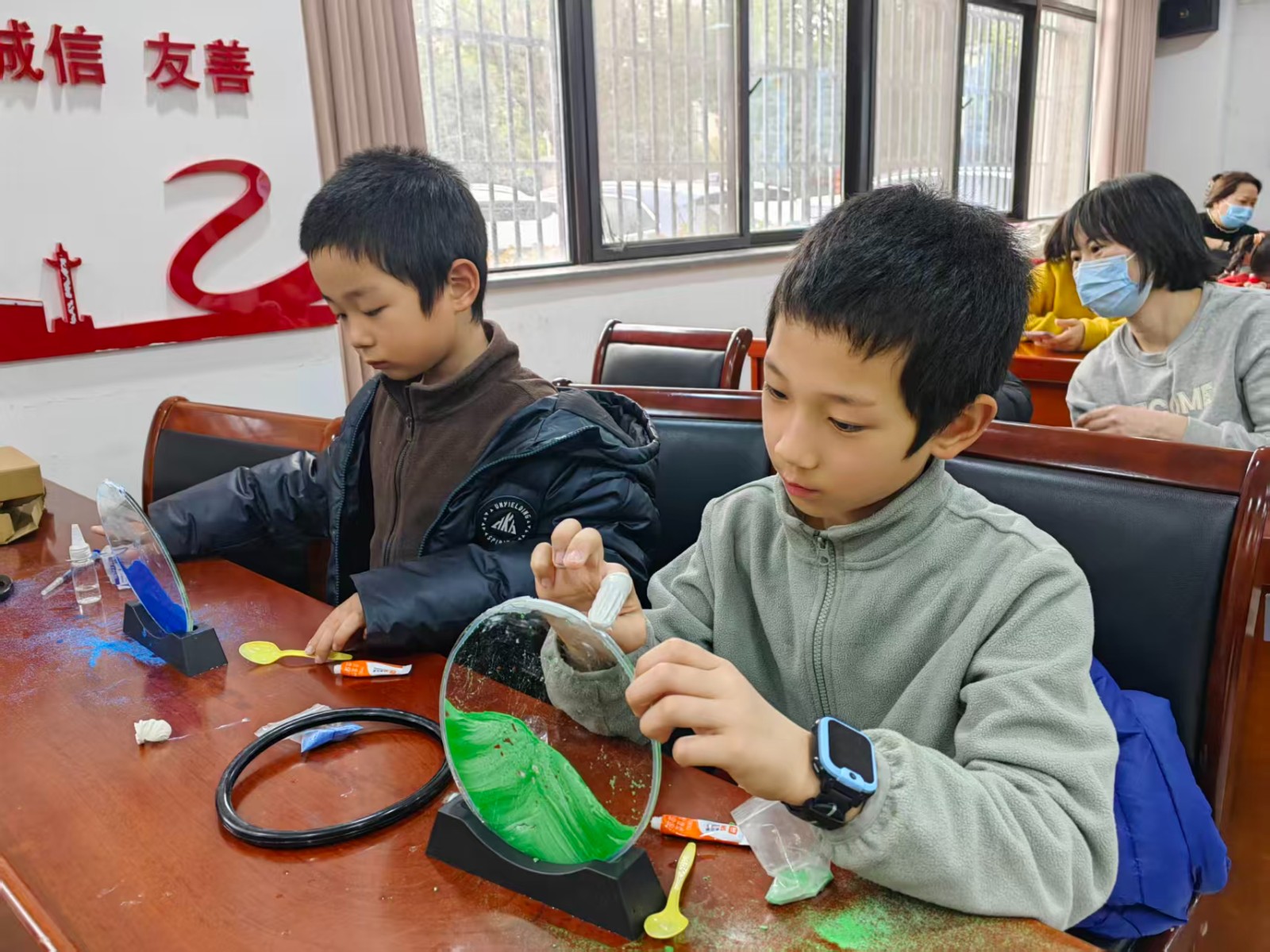 制作环节中,孩子们化身“小小艺术家”,在志愿者的协助下,小心翼翼地挑选心仪的彩沙,按照自己的创意逐层倒入画框。有的孩子搭配出梦幻的渐变色彩,有的则精心设计了层次分明的图案,偶尔遇到沙粒分布不均的问题,便主动向老师和同伴请教。经过耐心操作,一个个独一无二的流沙画作品相继诞生,将画框轻轻倒置,彩沙缓缓流淌,变幻出山脉、云朵、星河等奇妙景致,孩子们纷纷为自己的作品惊叹喝彩。