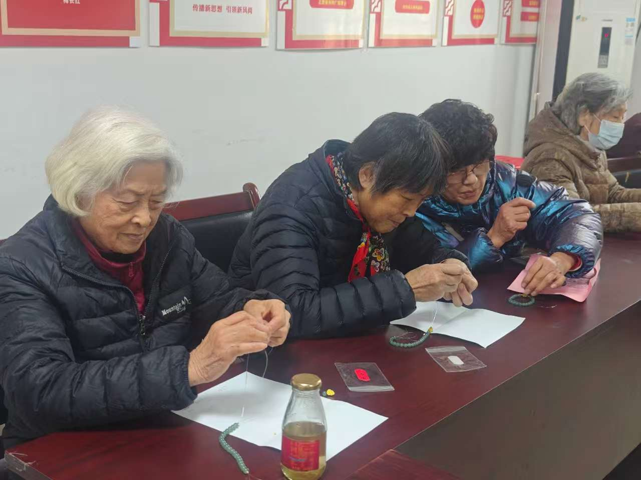 活动现场欢声笑语、暖意融融。手工老师首先为大家讲解了手串的寓意与制作技巧,随后居民们在指导下亲手穿珠、打结,将一颗颗象征“平安”“健康”“好运”的珠子串联成独一无二的新年手串。大家兴致勃勃地参与其中,现场洋溢着浓浓的年味与温情。