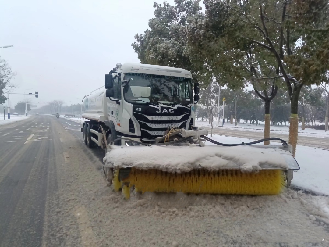 对于机动车道,环卫单位在洒水车、扫路车、垃圾运输的车头安装雪滚装置,变成了大型除雪车。当滚筒旋转时,筒体的刷毛与地面产生摩擦力,摩擦力使得刷毛与积雪之间产生相对滑动,从而将积雪卷起。随着车辆的行进,路面的积雪消失,恢复了道路本色。