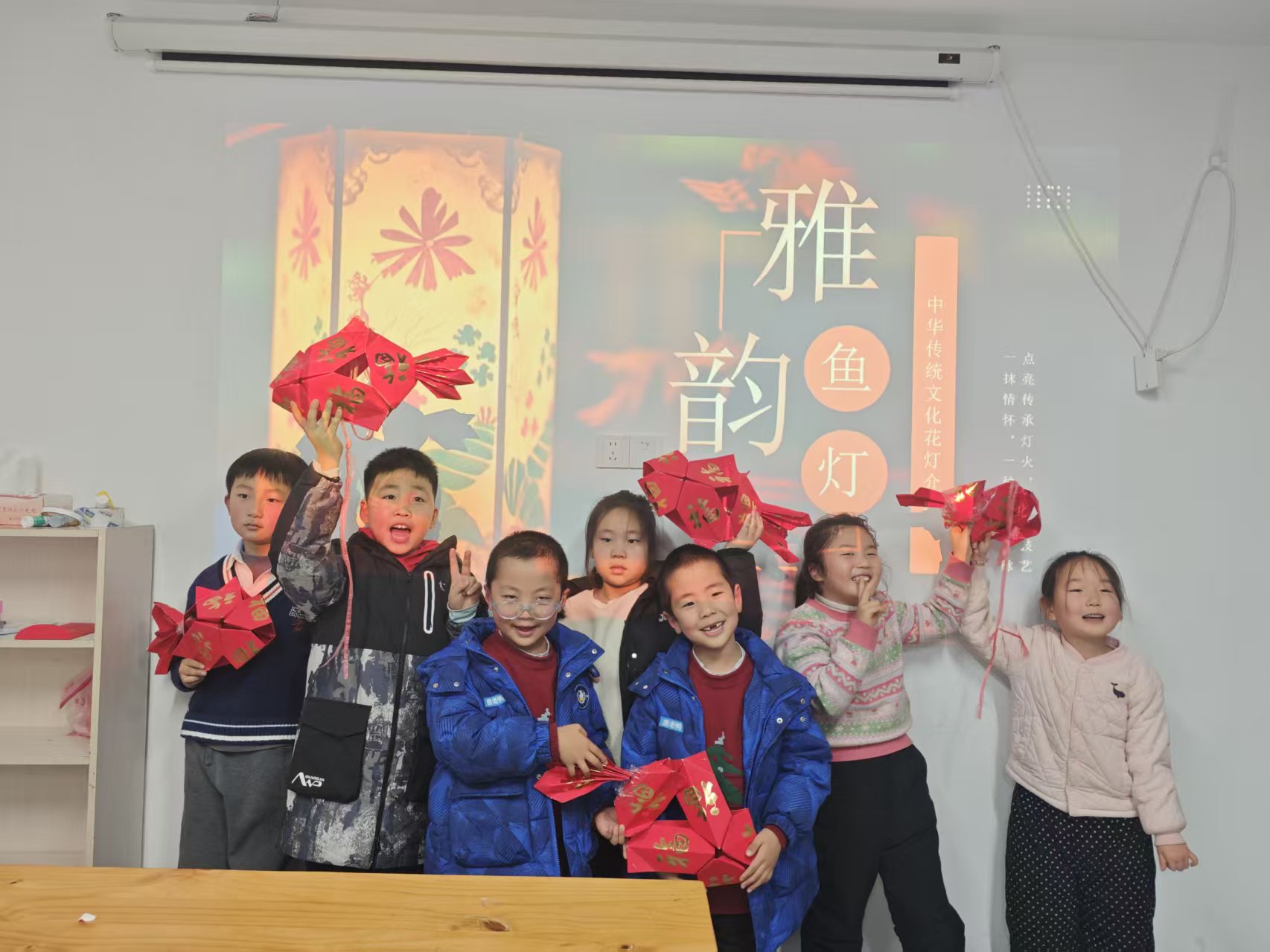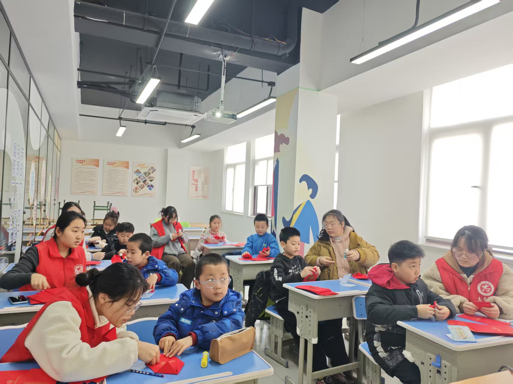 在“红包变鱼灯 非遗润童心”活动中,吴康芳老师首先为孩子们讲解鱼灯所承载的吉祥寓意与民俗渊源。随后,来自安徽医科大学2024级药学92班的赵瑞雪、安庆师范大学2024级汉语言文学5班的陈明冉、黄山学院2023级小学教育班的陈诺、安徽农业大学2024级机械专业的徐书辉等志愿者分组指导,细致讲解裁剪、折叠、粘贴等步骤。孩子们在帮助下一步步完成制作,一个个色彩鲜艳、造型灵动的红包鱼灯相继诞生,现场充满成就与喜悦。