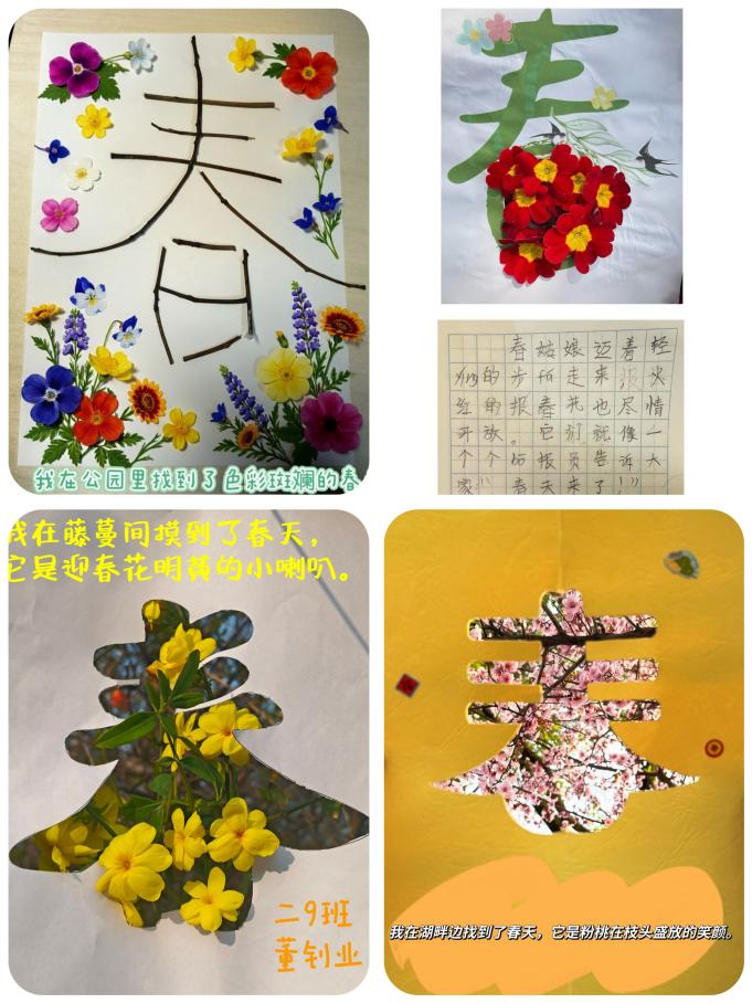 活动中,队员们在家长的陪伴下漫步春日户外,细心观察嫩绿的新芽、绽放的花朵,聆听枝头鸟鸣,真切感受大自然。在实践创作环节,大家化身“小小艺术家”,用画笔描绘春日轮廓,用落叶、花瓣拼贴创意作品,将春日美景定格在一幅幅充满童趣的作品中。有的同学绘制 “春” 字并搭配植物叶片,有的用镂空卡纸框取绿意书写春日感悟,还有的以花朵为素材创作趣味手工,让自然之美与创意想象巧妙融合。